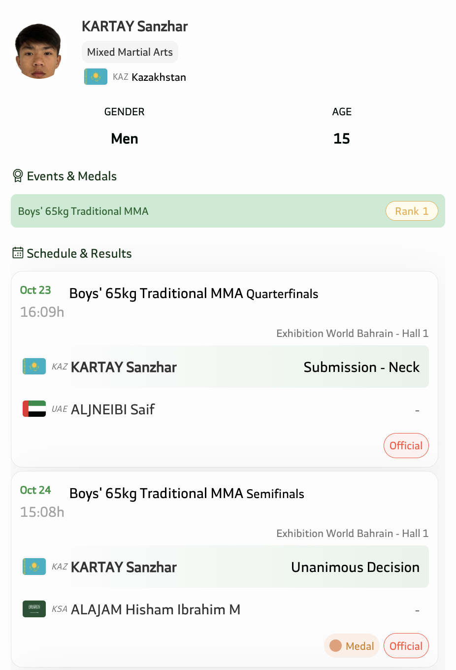 15-летний Санжар Картай одержал блестящую победу в финале, победив 17-летнего Султанахмеда Султанахмедова из Бахрейна. Казахстанский боец показал уверенную технику и превосходство на протяжении всего поединка.