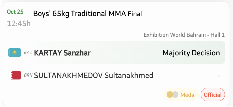 Следом за победой Амелины Бакиевой Казахстан взял второе подряд золото в ММА на юношеских Азиатских играх-2025 в Манаме (Бахрейн).