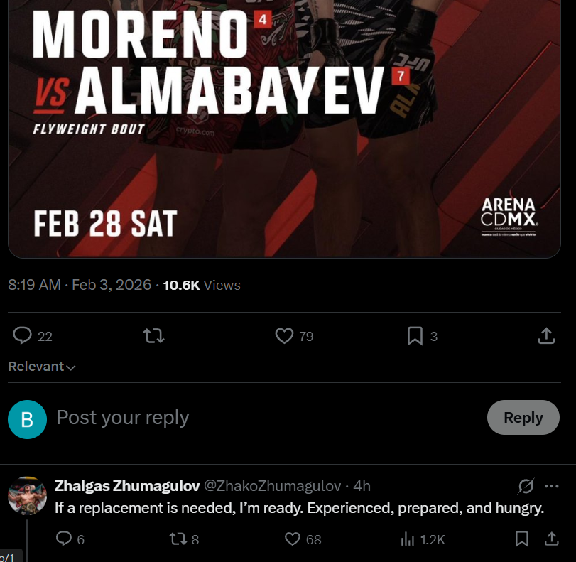 Казахстанский боец наилегчайшего веса Жалгас Жумагулов (19-9) сообщил о желании сменить своего соотечественника Асу Алмабаева (23-3) в главном бою турнира UFC в Мексике, сообщает Спорт Шредингера.