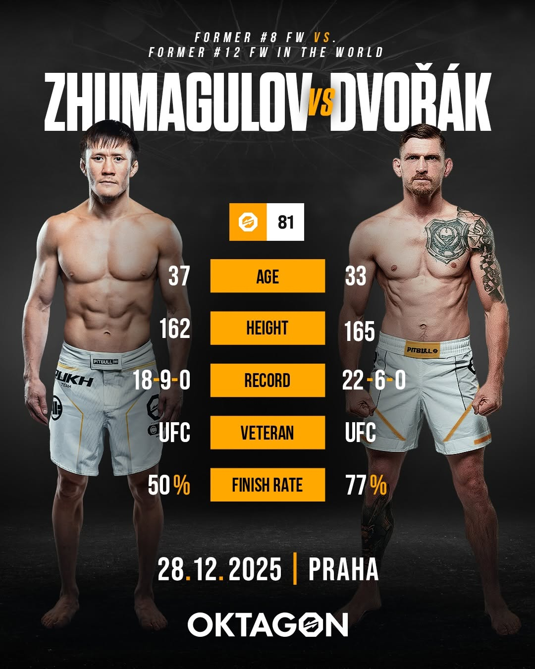 Чемпион чешского Oktagon в наилегчайшем весе Жалгас Жумагулов и чех Давид Дворак выступят в со-главном событии Oktagon 81 в Праге, сообщает Спорт Шредингера.