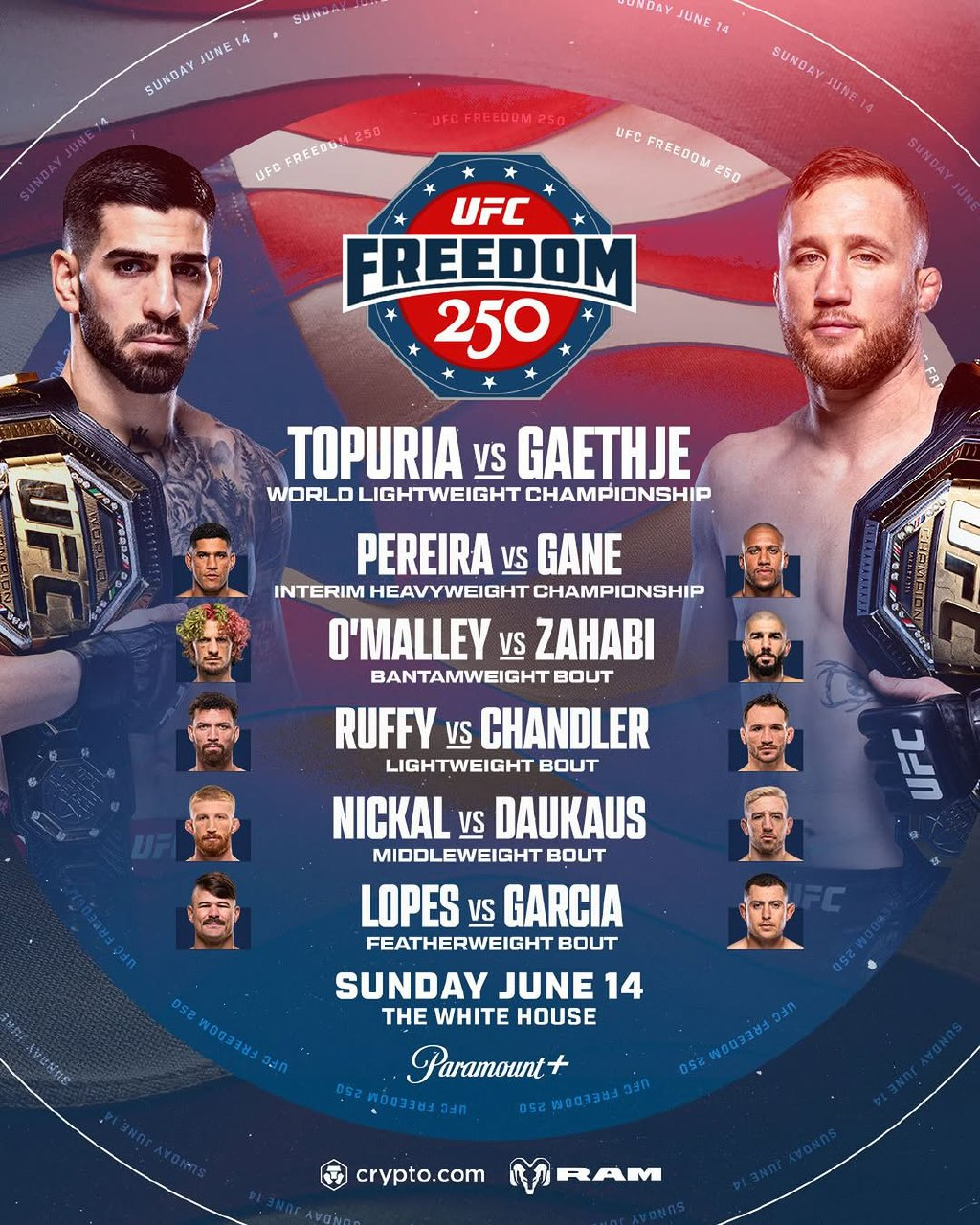 Кард UFC Freedom 250 представили во время UFC 326 в Лас-Вегасе. В ивенте на 14 июня будет шесть поединков, два из которых – титульные. Главным событием станет бой за чемпионский пояс в легком весе: Илия Топурия против временного чемпиона Джастина Гейджи.