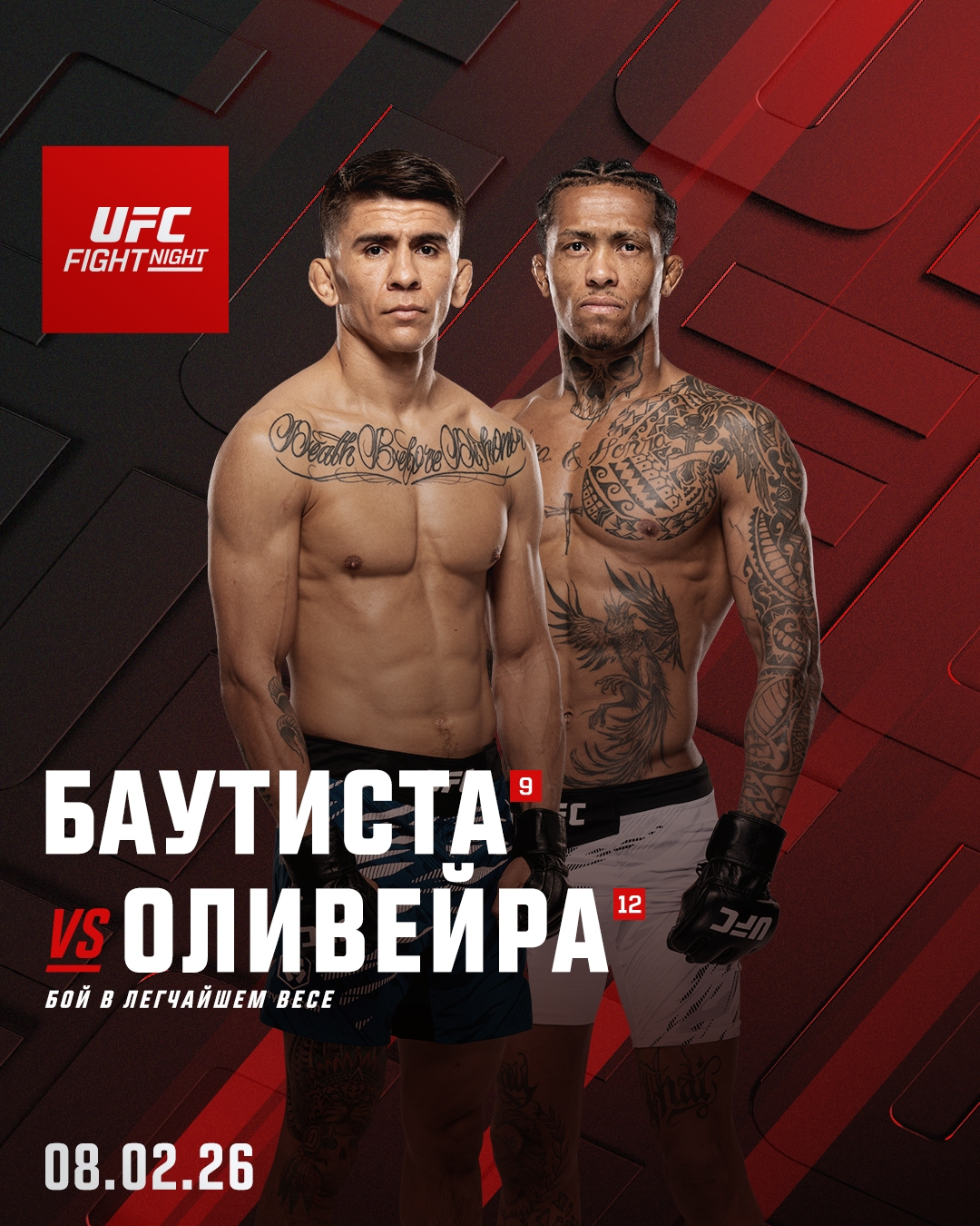 UFC Vegas 112 на 7 февраля возглавит рейтинговый бой в легчайшем весе 🇺🇸Марио Баутиста - 🇧🇷Винисиус Оливейра. На одном турнире с Веретенников дебютирует в UFC экс-чемпион Naiza в легком весе - украинец Даниил Донченко, который выиграл реалити-шоу The Ultimate Fighter и теперь поднялся в полусредний вес.