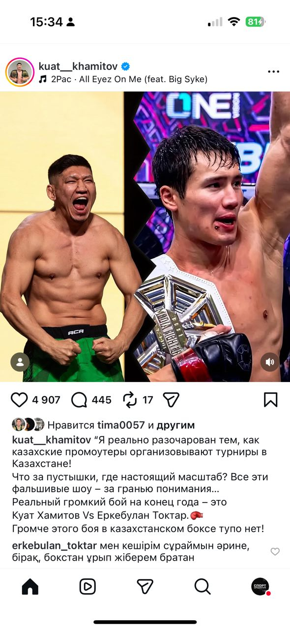 Куат на своей странице в Instagram наехал на казахстанских промоутеров и заявил, что поединок с Еркебуланом стало бы главным событием года в стране.