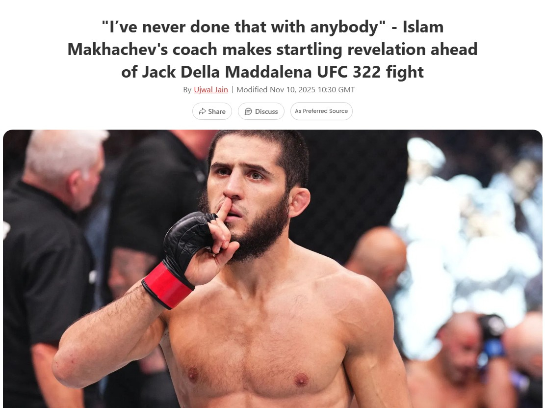 Ислам Махачев имеет в своем активе 27 побед (18 - досрочно) и одно поражение. Сейчас россиянин идет на серии из 15 побед подряд и 16 ноября в Нью-Йорке проведет бой против Джека Деллы Маддалены на турнире UFC 322.