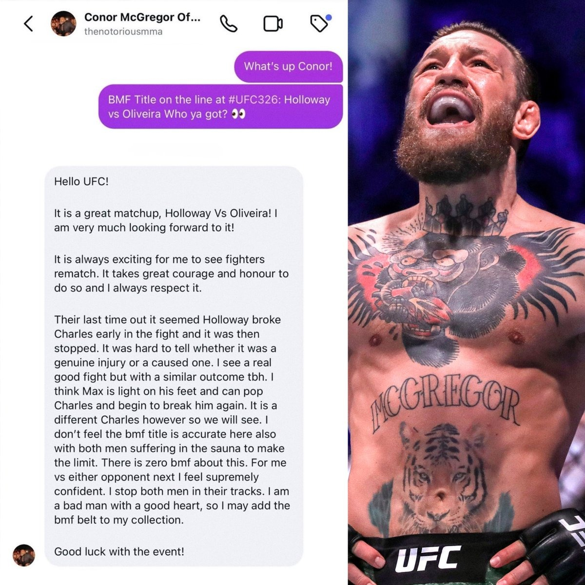 Думаю, нас ждёт хороший бой, и, как мне кажется, с похожим исходом. Макс очень подвижен – он будет попадать по Чарльзу и снова его ломать. Но это уже другой Чарльз, так что посмотрим. При этом я не считаю, что титул BMF здесь уместен, ведь оба бойца мучаются в сауне, чтобы уложиться в лимит веса. В этом нет ничего от BMF. Что касается моего боя с любым из них – я предельно уверен в себе. Я остановлю обоих. Я плохой человек с добрым сердцем, так что, возможно, добавлю пояс BMF в свою коллекцию. Удачи с турниром! - написал Макгрегор в соцсетях.