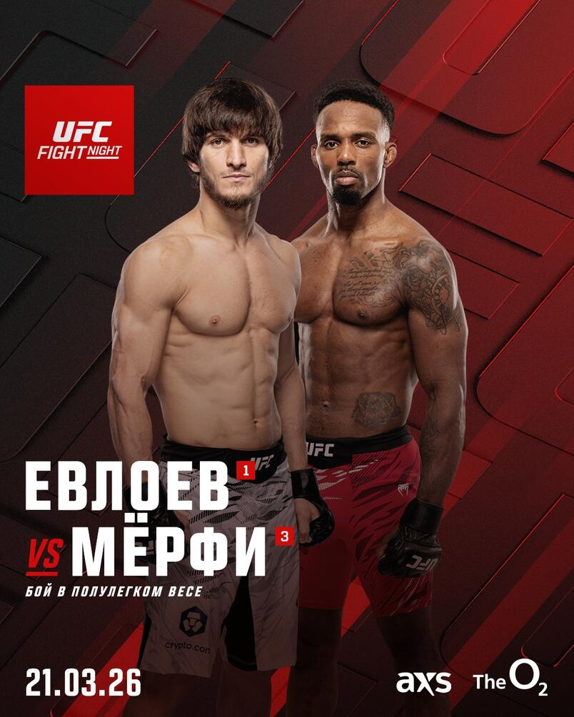 21 марта 2026 года на турнире UFC в Лондоне (Англия) состоится один из ключевых боёв полулегкого дивизиона - Мовсар Евлоев встретится с британцем Лероном Мёрфи. Оба бойца идут без поражений и находятся в шаге от титульного шанса, поэтому этот поединок может определить следующего претендента на пояс, которым владеет Александр Волкановски.