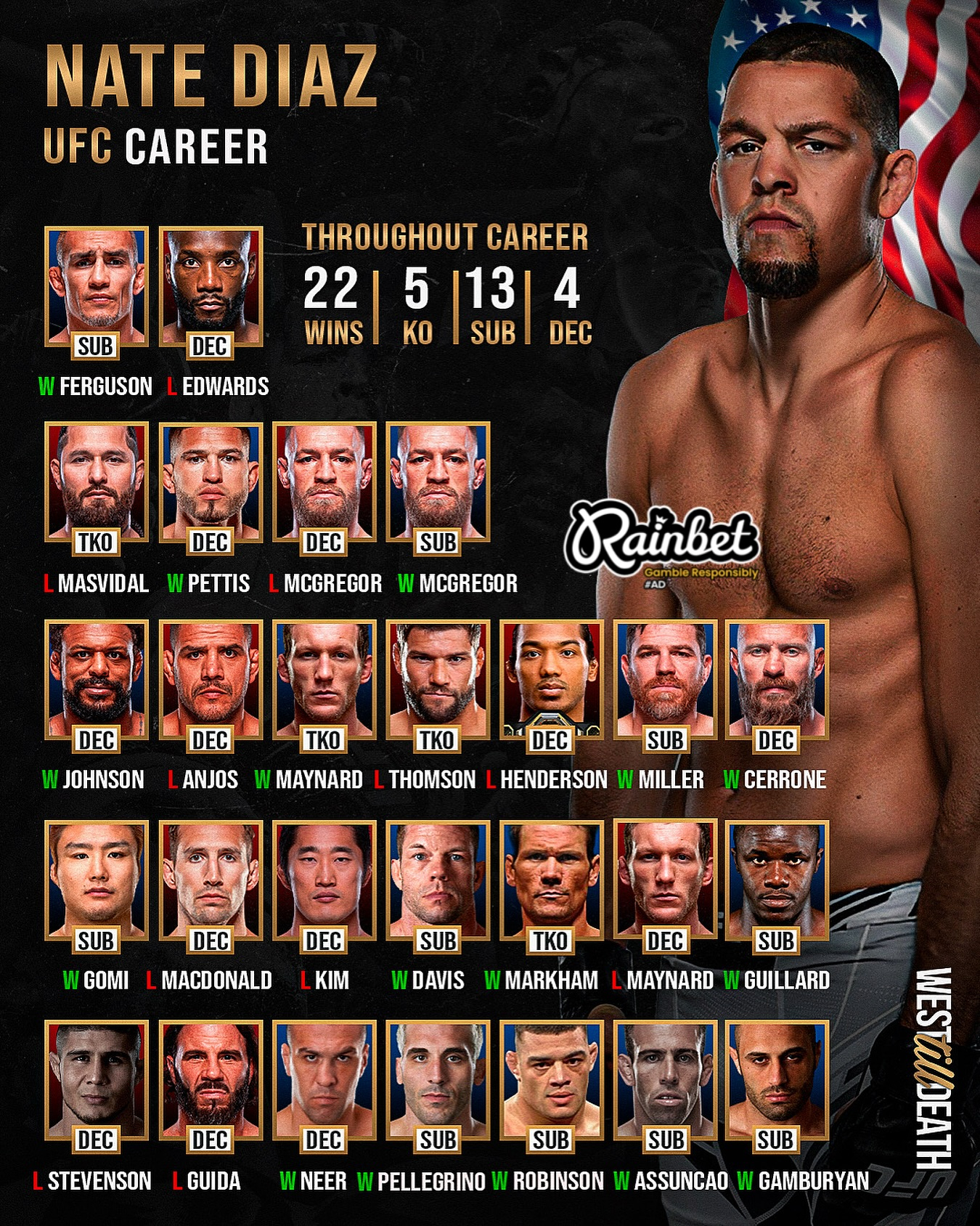 Ранее 40-летний Нейт анонсировал возвращение в UFC и называл сразу трёх желанных оппонентов: Конора Макгрегора, Дастина Порье и Майка Перри. За время выступлений в UFC с 2007 по 2022 годы Диас провёл 27 боев, одержав 16 побед и став одним из самых узнаваемых бойцов своего поколения.