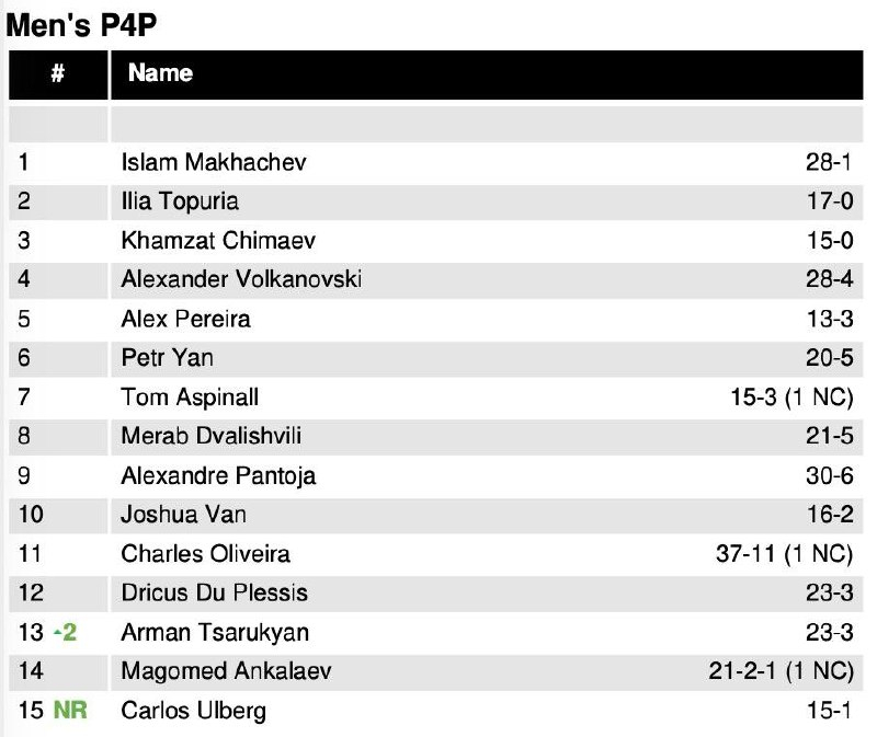 В мужском рейтинге Pound-for-Pound произошли следующие изменения: Арман Царукян вернулся в топ и занял 13-е место. Примечательно, что новый чемпион UFC в полутяжёлом весе Карлос Олберг расположился лишь на 15-й позиции, а бывший чемпион Магомед Анкалаев на 14-й. Оба оказались ниже Царукяна.