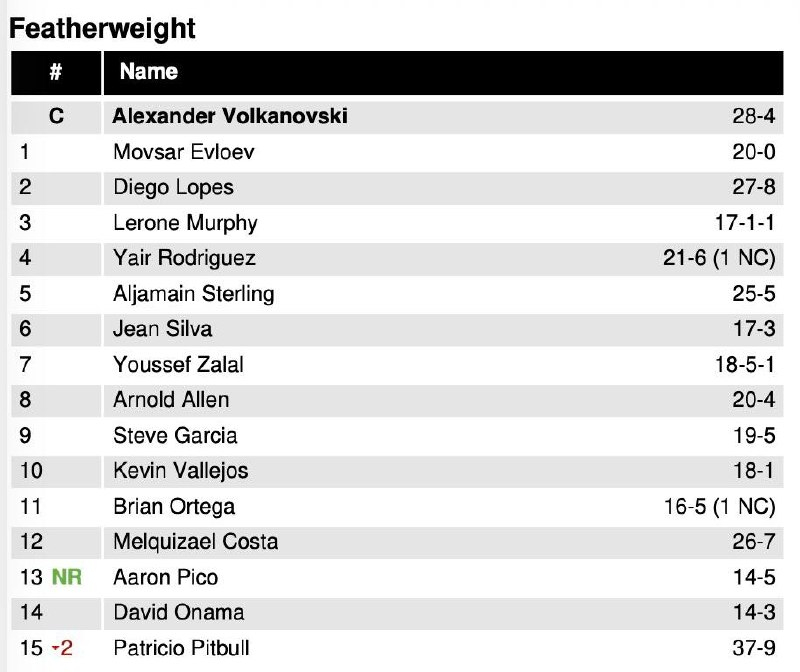 В полулёгком весе в топ-15 дебютировал Аарон Пико. Американец после победы над Патрисио "Питбулем" Фрейре поднялся на 13-ю строчку, а бразилец опустился на 15-ю позицию.