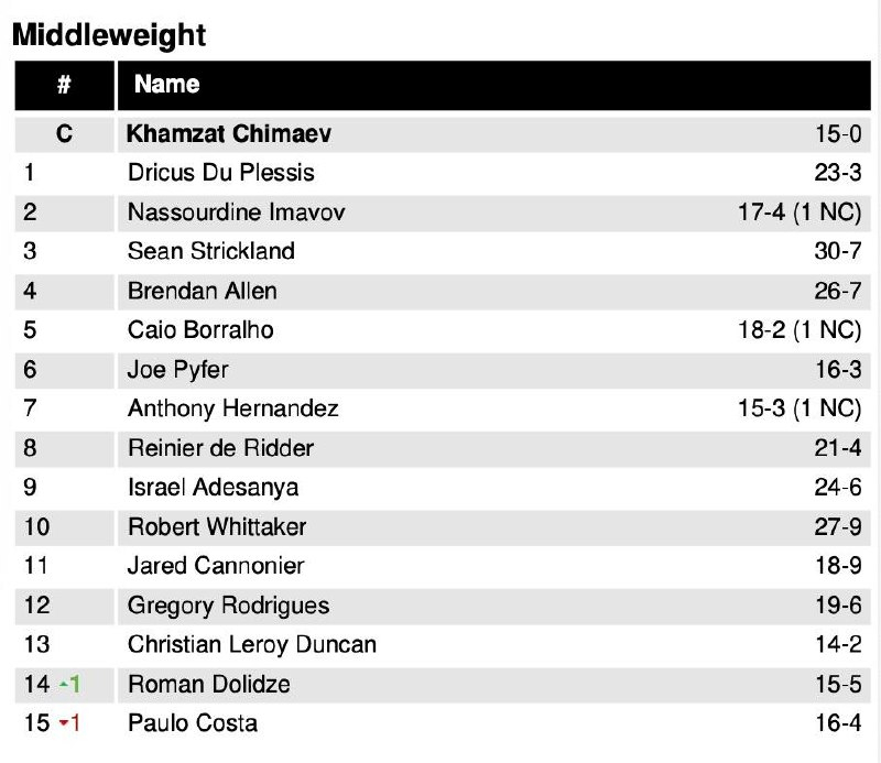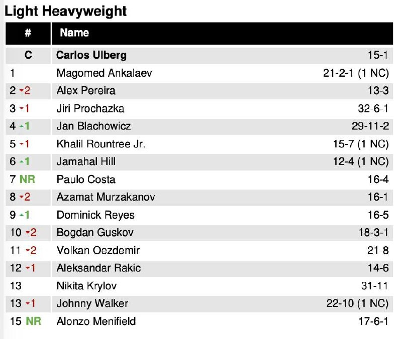 Серьёзные изменения произошли в полутяжёлом весе, где появился новый чемпион: Карлос Олберг нокаутировал Иржи Прохазку в первом раунде на UFC 327. Бывший чемпион Алекс Перейра опустился на второе место, а Прохазка на третье.
