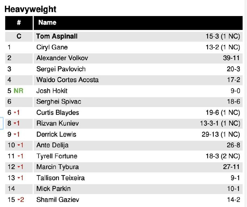 Значимые изменения произошли и в тяжёлом весе: Джош Хокит резко поднялся в рейтинге, победив Кёртиса Блейдса, и ворвался в топ-5, хотя до боя не входил даже в топ-15.