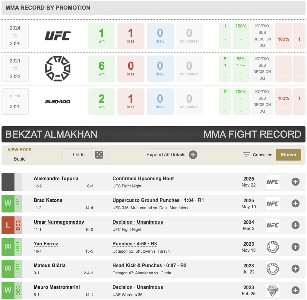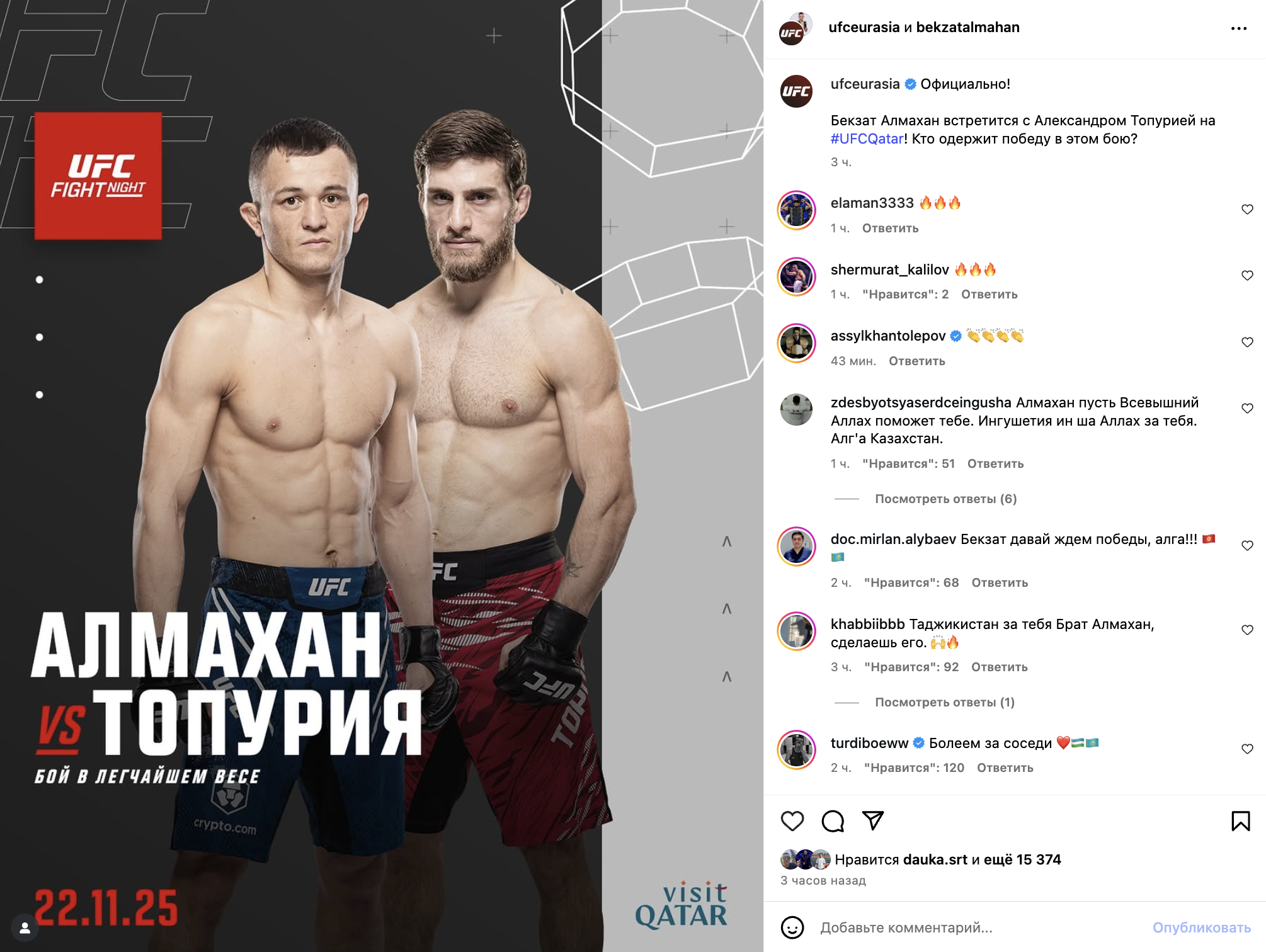Казахстанский боец Бекзат Алмахан проведёт следующий поединок 22 ноября на турнире UFC Fight Night в Катаре, сообщает Спорт Шредингера.
