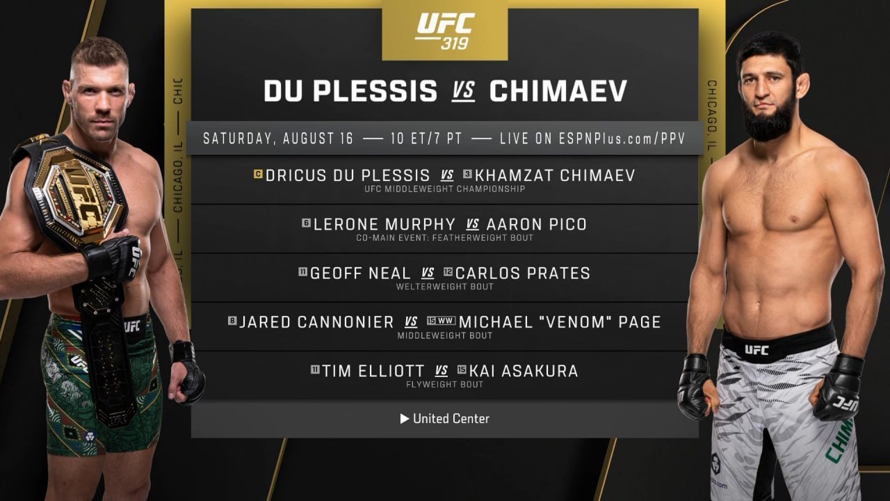 🇿🇦 Дрикус дю Плесси (чемпион, 23–2) vs 🇦🇪 Хамзат Чимаев (№3, 14–0)