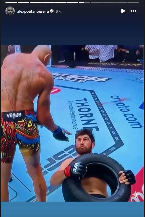 Также бразилец опубликовал публикацию, в которой использовал фотожабу. Он высмеял обещания представителей Анкалаева отправить Перейру обратно на шиномонтажку.