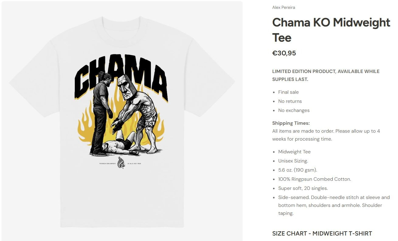 Бразилец анонсировал выпуск лимитированной коллекции футболок, на которых изображён момент победы — поверженный Анкалаев и рефери, стоящий рядом. Стоимость такого мерча составляет 30,95 евро.