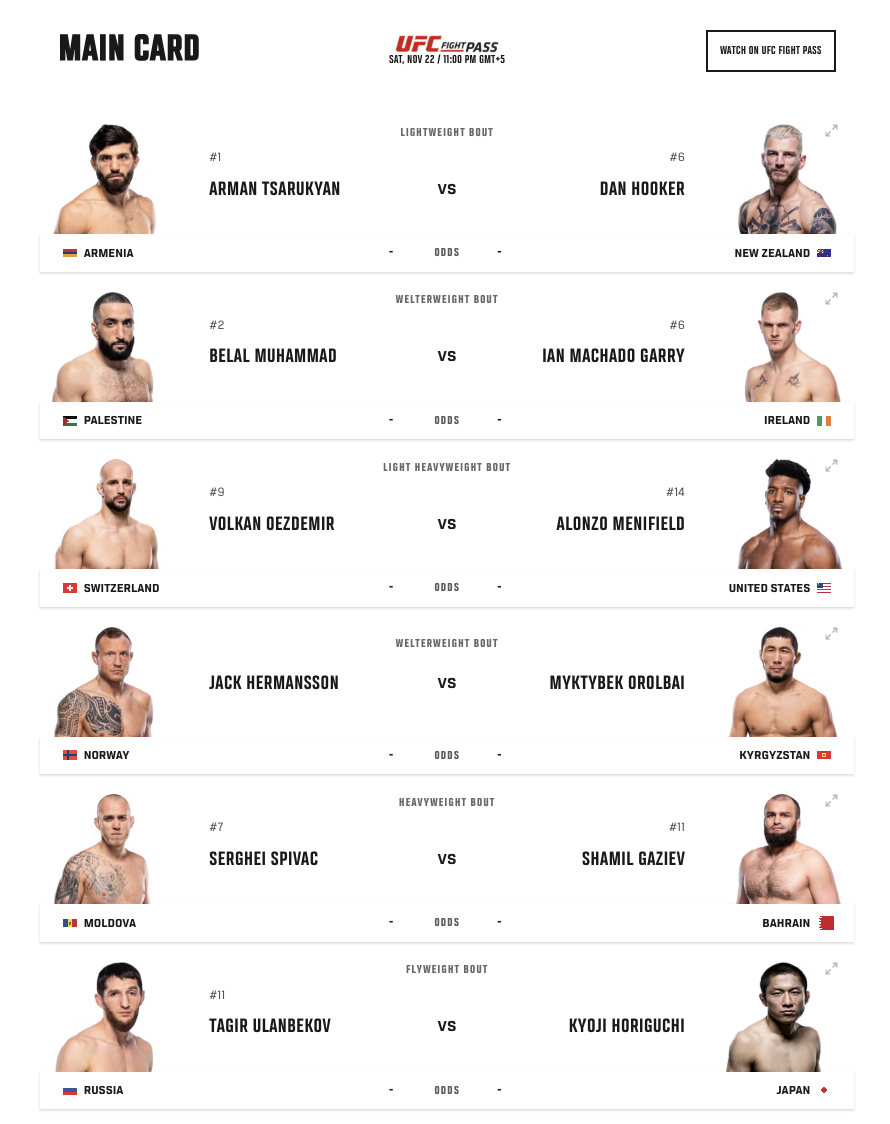Главный бой шоу - противостояние в лёгком весе между Арманом Царукяном (№1, 22–3) и Дэном Хукером (№6, 24–12). Также в карде - громкий бой Белала Мухаммада с Ианом Гэрри за второе место в полусреднем дивизионе и, возможно, претендентский шанс на титул UFC.