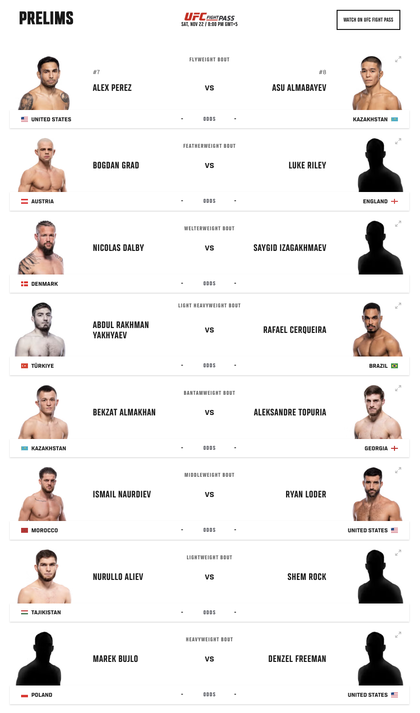 - Алмабаев (22–3, UFC 5–1) встретится с бывшим претендентом на титул, американцем Алексом Пересом (25–9, UFC 7–5).