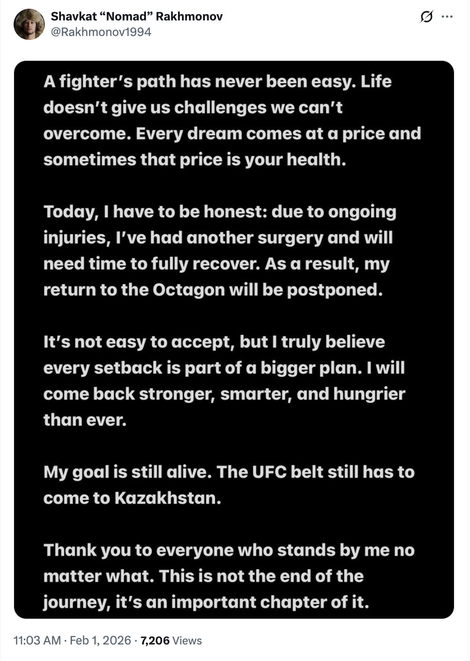 Казахстанский боец UFC Шавкат Рахмонов сообщил о переносе своего возвращения в октагон из-за очередной операции, сообщает Спорт Шредингера.