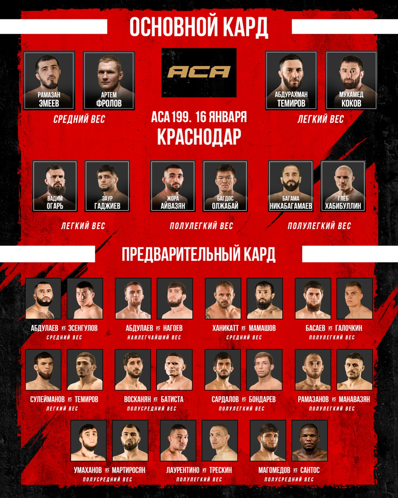 Главным событием АСА 199 будет поединок экс-бойца UFC Рамазана Эмеева против Артема Фролова. Изначально мейн-ивентом стоял бой Алексея Полпудникова и Расула Магомедова, но Полпудников провалил взвешивание 2,5 кг.