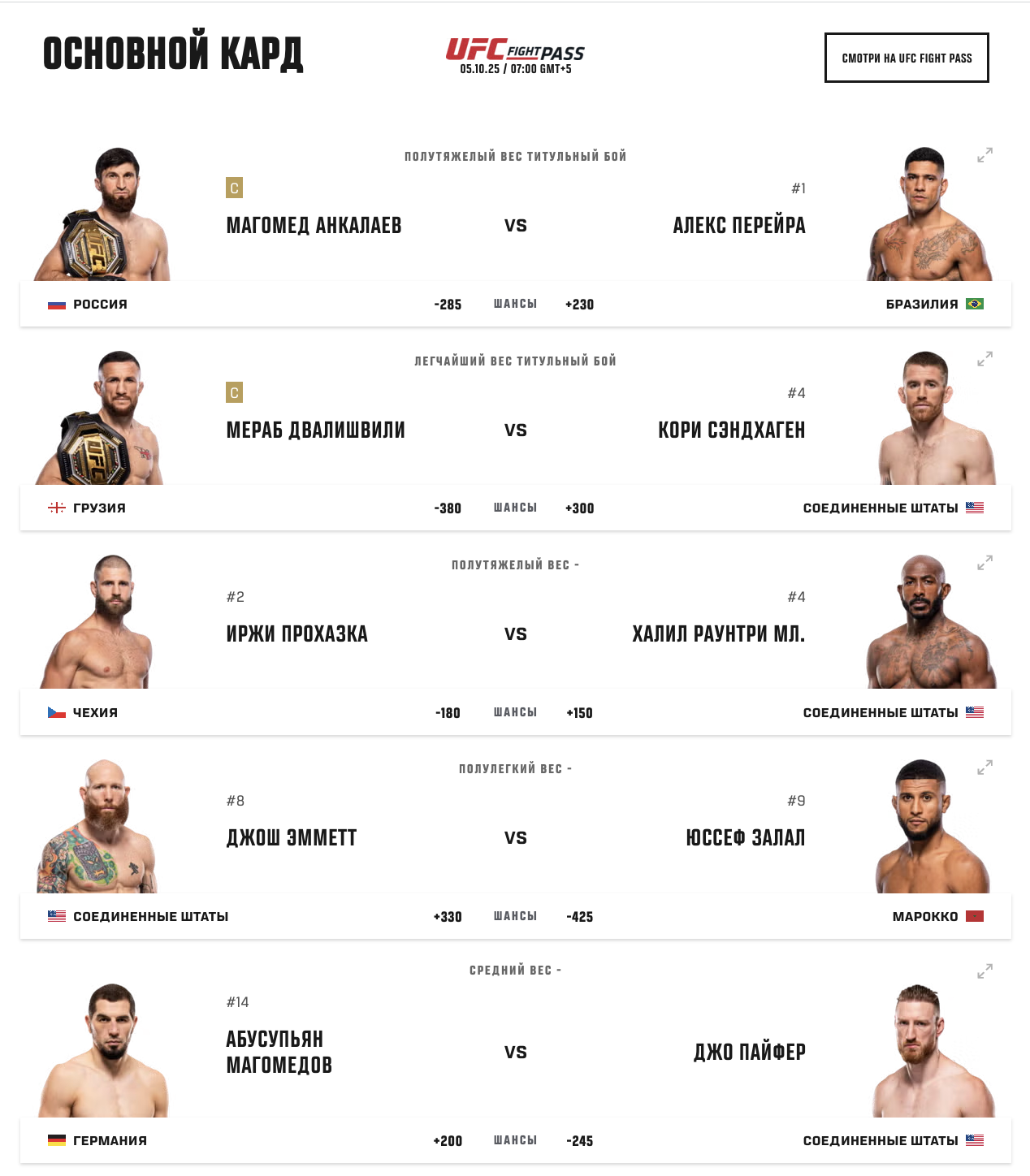 🇷🇺 Магомед Анкалаев (Россия, чемпион, 20–1–1) vs 🇧🇷 Алекс Перейра (Бразилия, №1, 12–3)