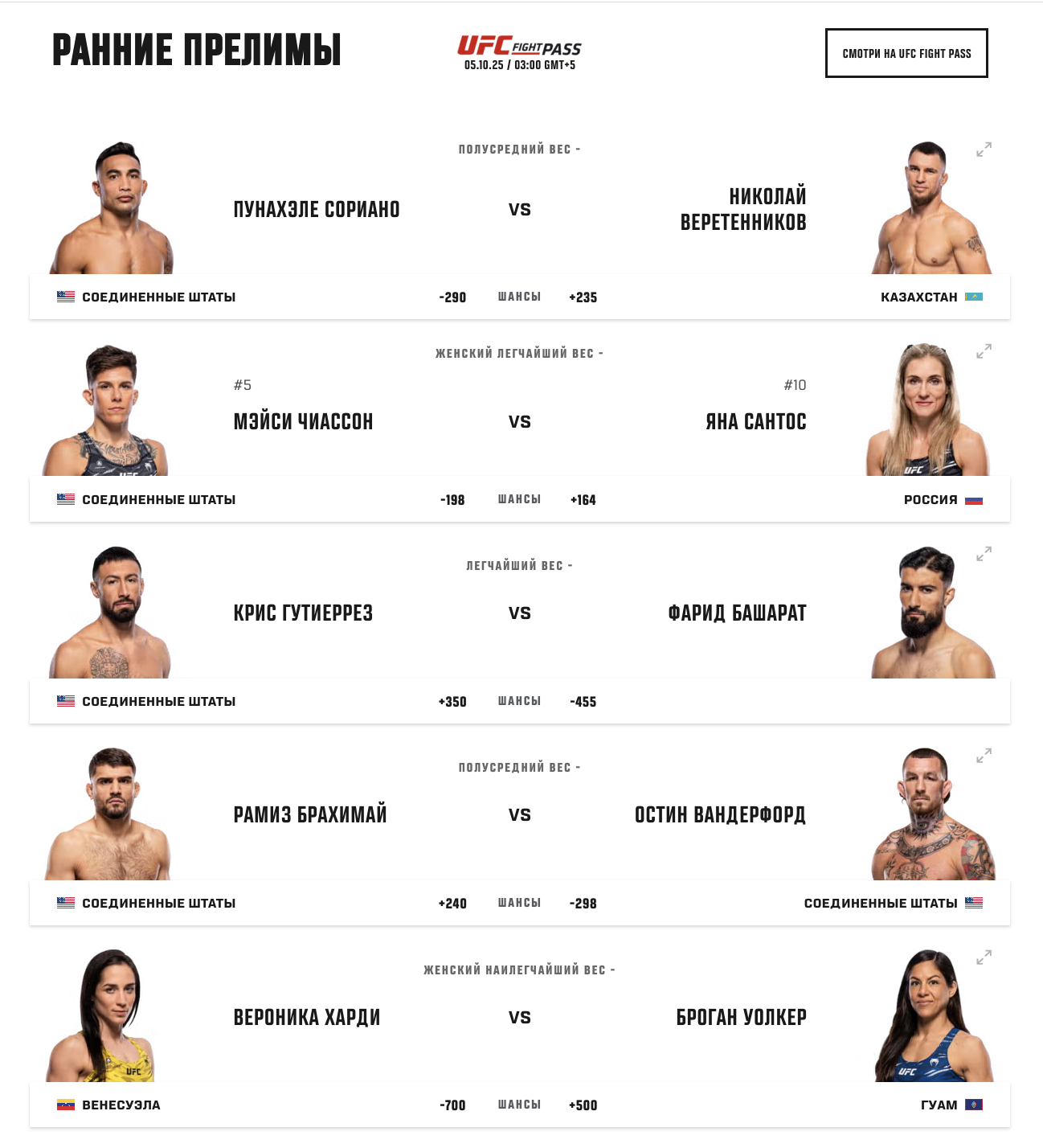 Особое внимание казахстанских фанатов приковано к Николаю Веретенникову (Казахстан, 13-6), который выступит в ранних прелимах. Его соперником станет американец Пунахэле Сориано (11-4).