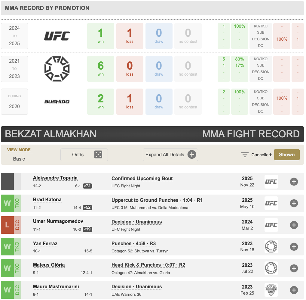 28-летний Бекзат Алмахан проведёт свой третий поединок в UFC. Казахстанец дебютировал в марте 2024 года боем с тогда еще непобежденным россиянином Умаром Нурмагомедовым, которому уступил решением судей.