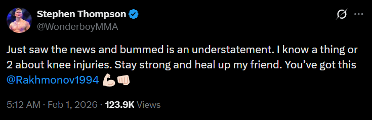 Американский боец полусреднего веса UFC Стивен Томпсон (17-9-1) поддержал казахстанца Шавката Рахмонова (19–0), который недавно перенес операцию, сообщает Спорт Шредингера.