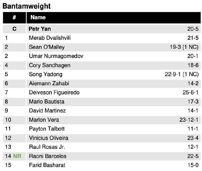 Бразильский ветеран Раони Барселос наконец ворвался в топ-15. На прошедшем турнире он победил раздельным решением Монтела Джексона, который до боя занимал 14-ю строчку.