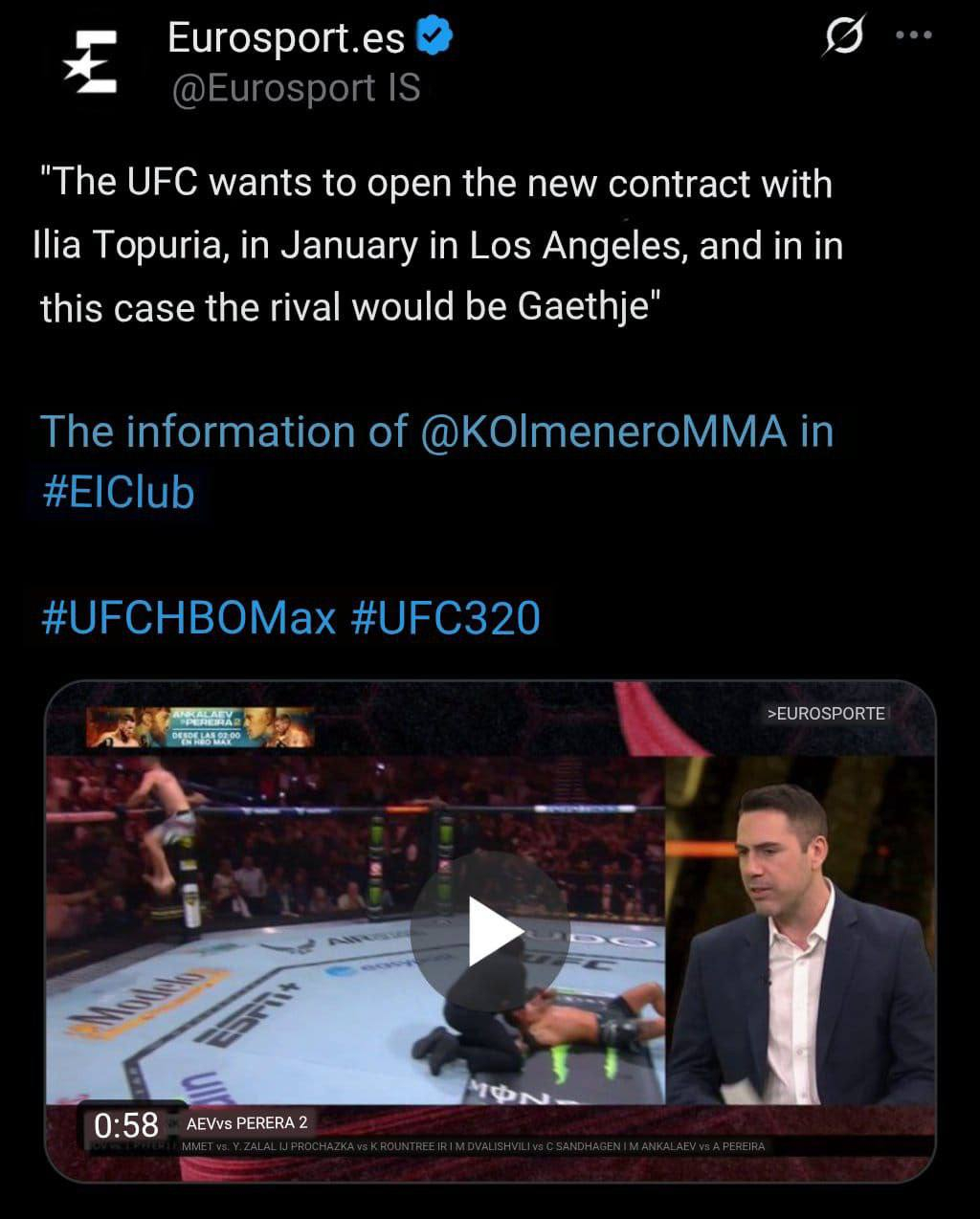 Испанский журналист Альваро Колменеро с Eurosport очень близок к Топурии и первый анонсировал его несколько боев, а теперь дает такой инсайд: Илия против Джастина Гейджи в январе в Лос-Анджелесе.