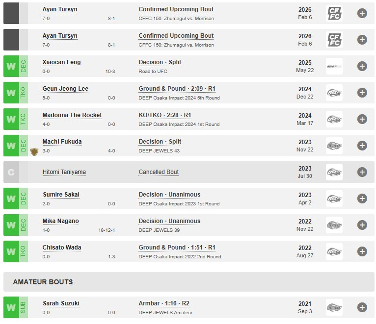 Соперницей Турсын станет непобежденная представительница Японии Арица Мацуда с рекордом 7-0.Свой последний бой Мацуда выиграла в рамках проекта Road to UFC.