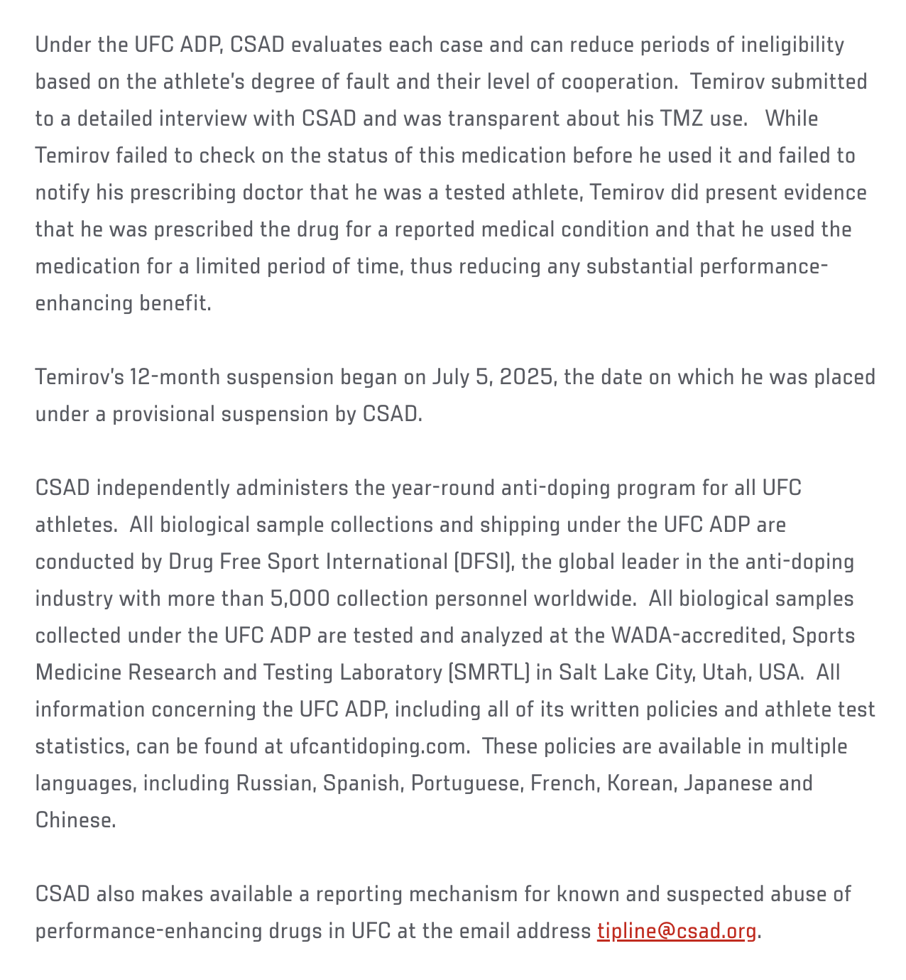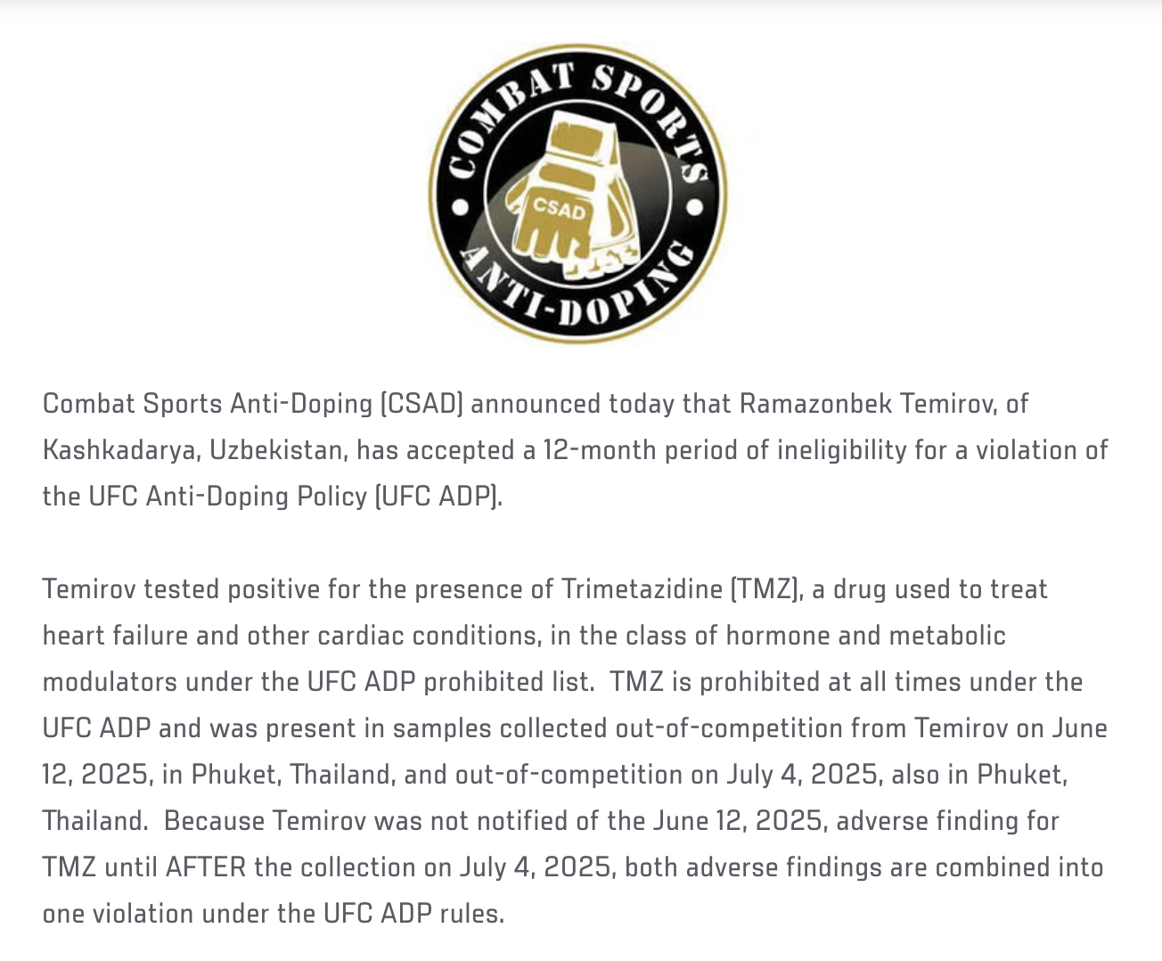 Бойцовская антидопинговая организация (CSAD) объявила, что узбекистанский боец UFC Рамазонбек Темиров получил 12-месячную дисквалификацию за применение запрещённого препарата триметазидина (TMZ).
