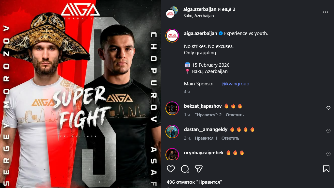 Морозов проведет свой поединок по правилам грэпплинга 15 февраля в Баку (Азербайджан) на турнире AIGA. Его соперником станет чемпион UAE Warriors в легчайшем весе азербайджанский файтер Асаф Чопуров.