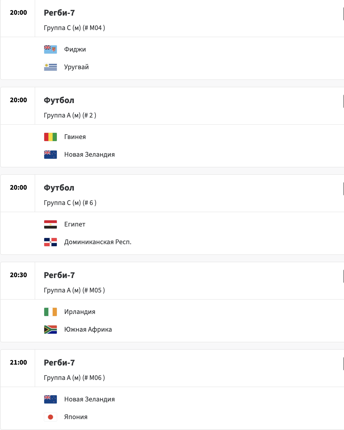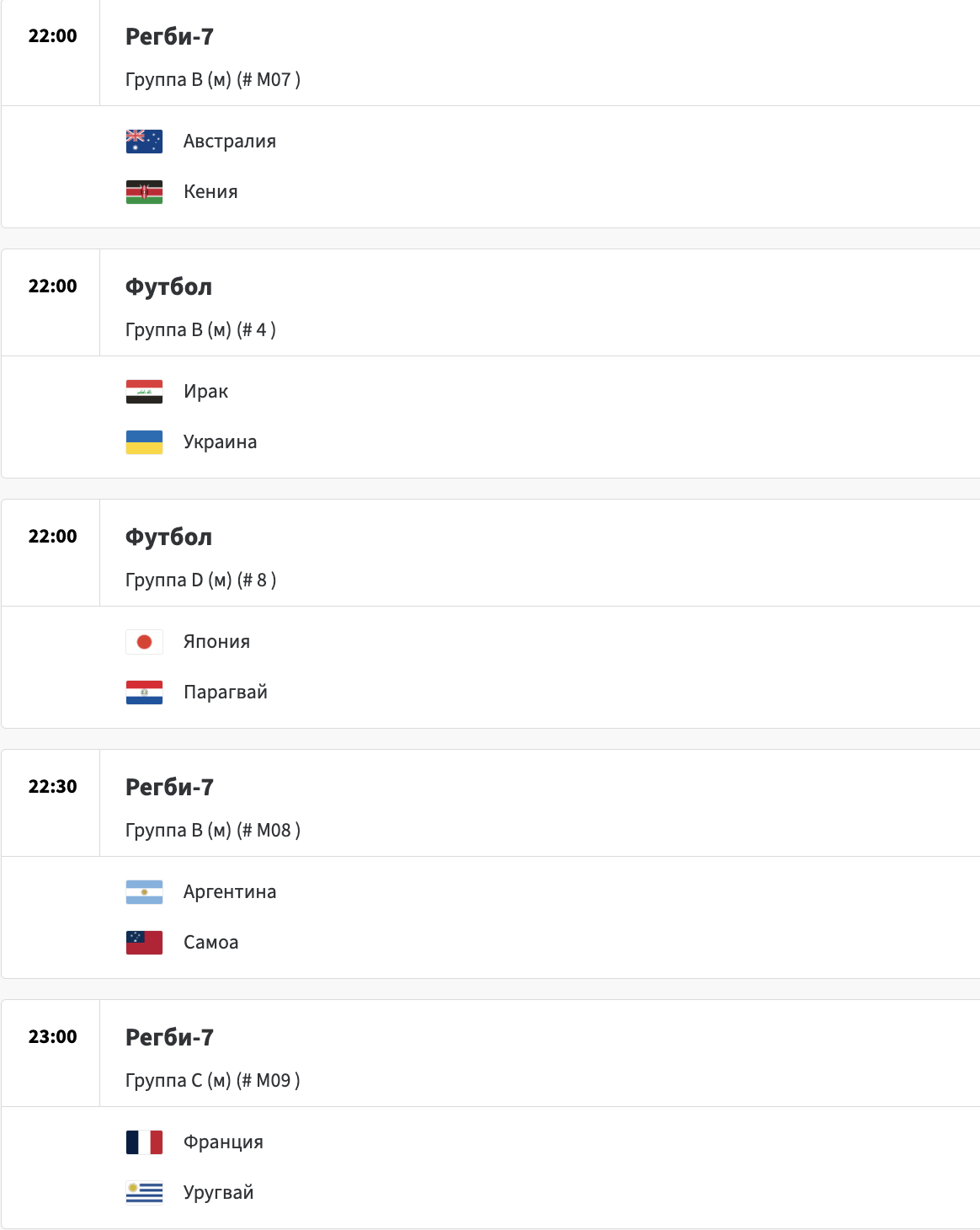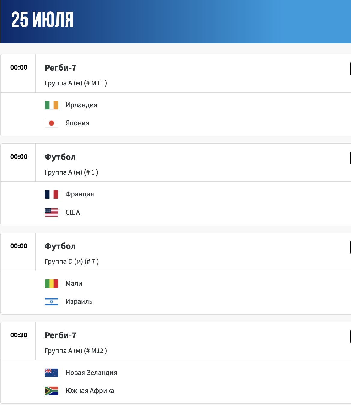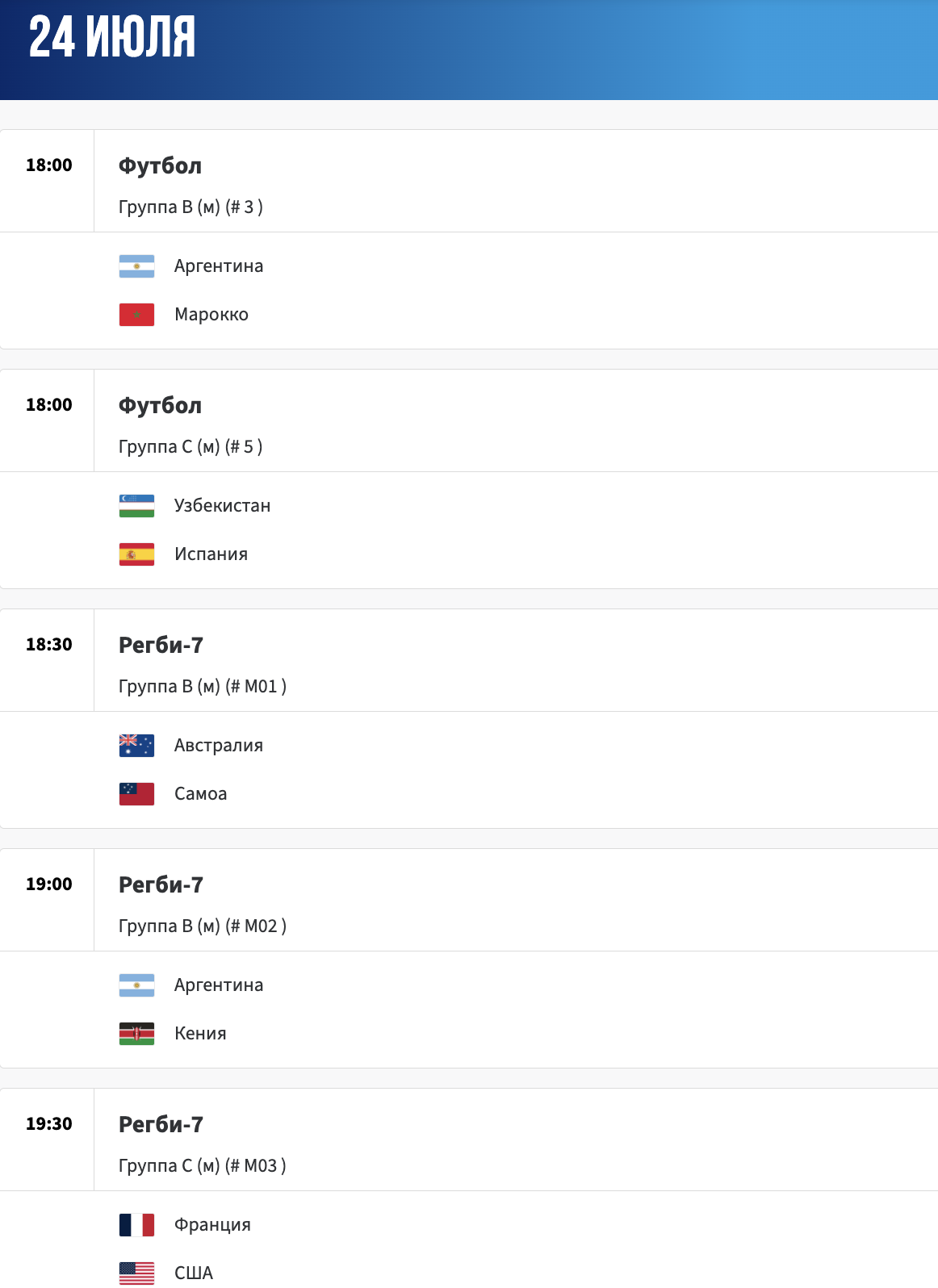 Уже сегодня, 24 июля, стартует Олимпиада-2024 в Париже и в первый день пройдут мужские соревнования по футболу и регби, сообщает Спорт Шредингера.