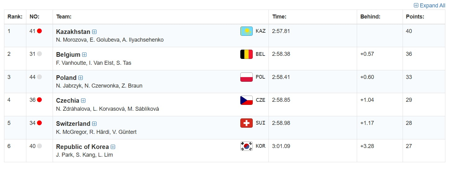 Казахстанки показали результат 2 минуты 57.81 секунды. В топ-3 также команды Бельгии и Польши.