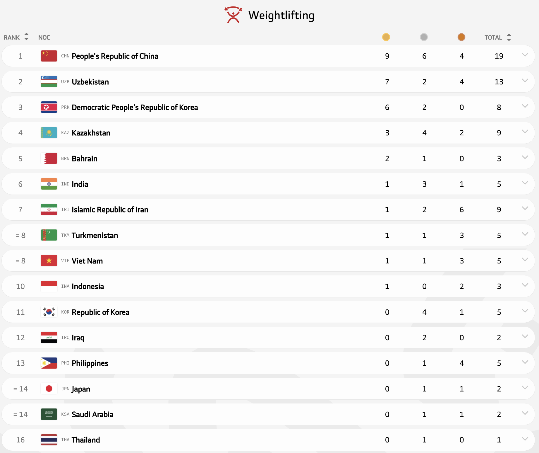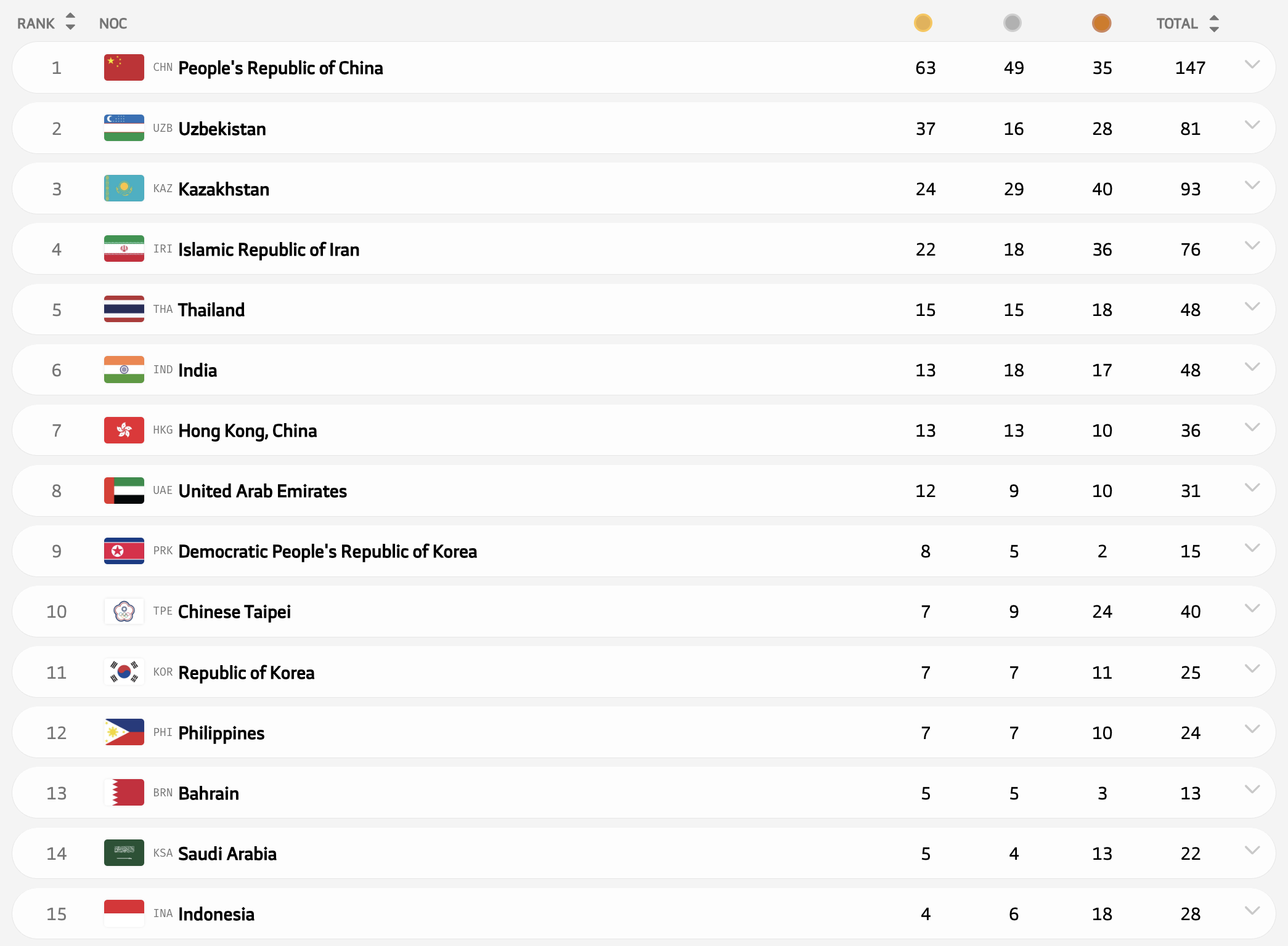 - Китай - 63 золота, 49 серебра, 35 бронз (147 медалей)