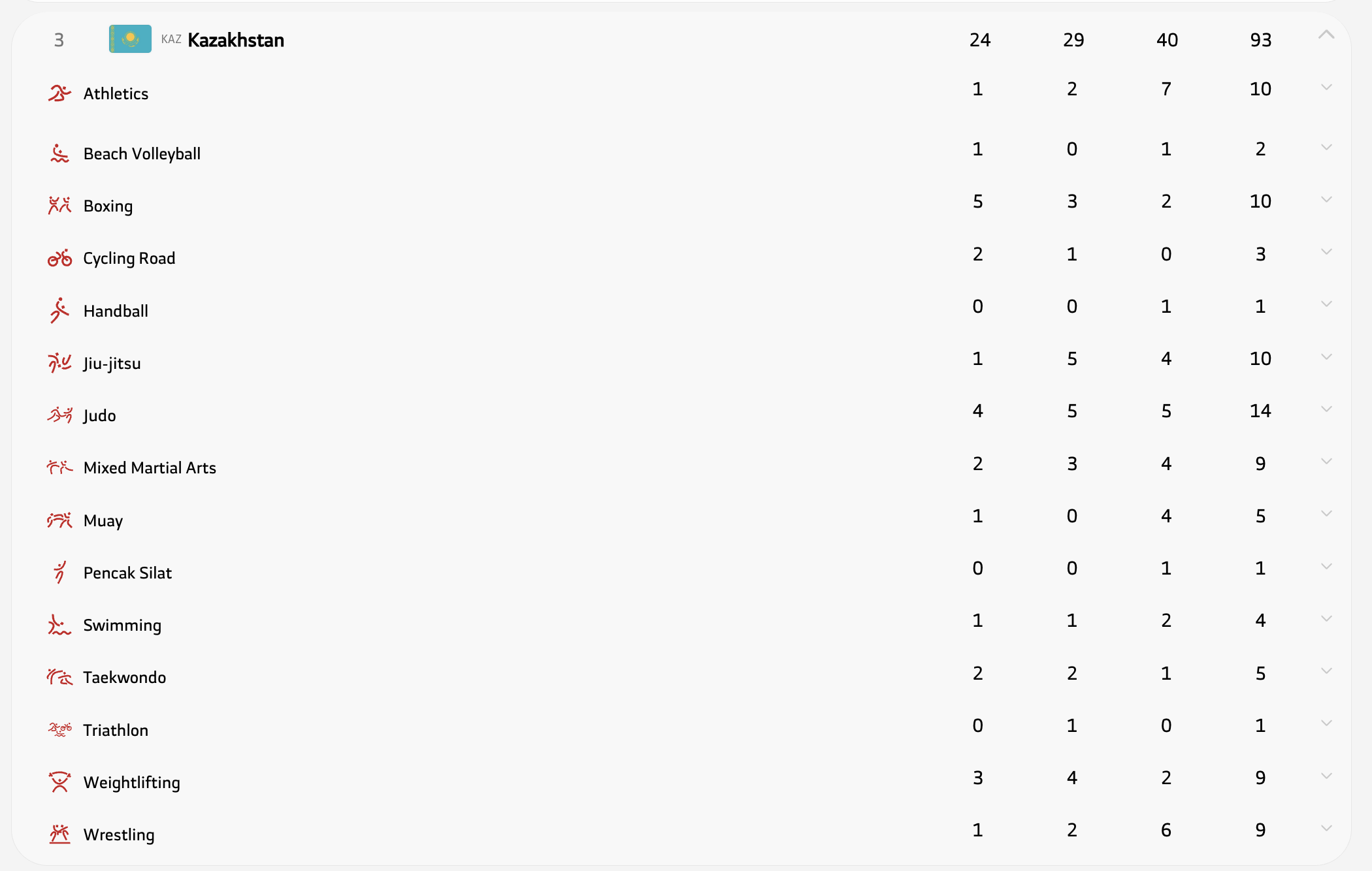 - Казахстан - 24 золота, 29 серебра, 40 бронз (93 медали)