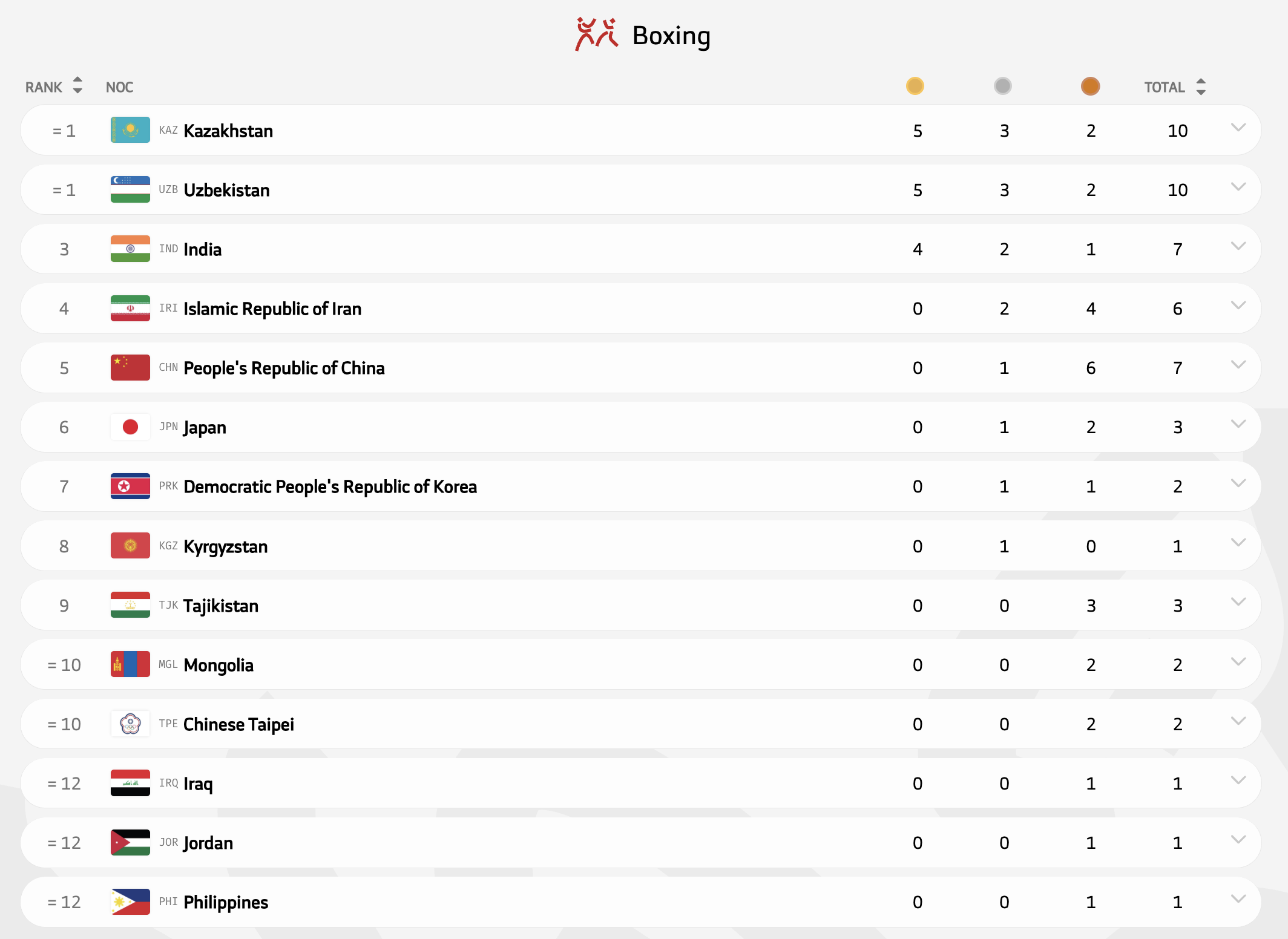В боксе Казахстан и Узбекистан поделили лидерство в общем медальном зачете - по 10 медалей: 🥇- 5 золотых, 🥈 - 3 серебряных и 🥉- 2 бронзовых.
