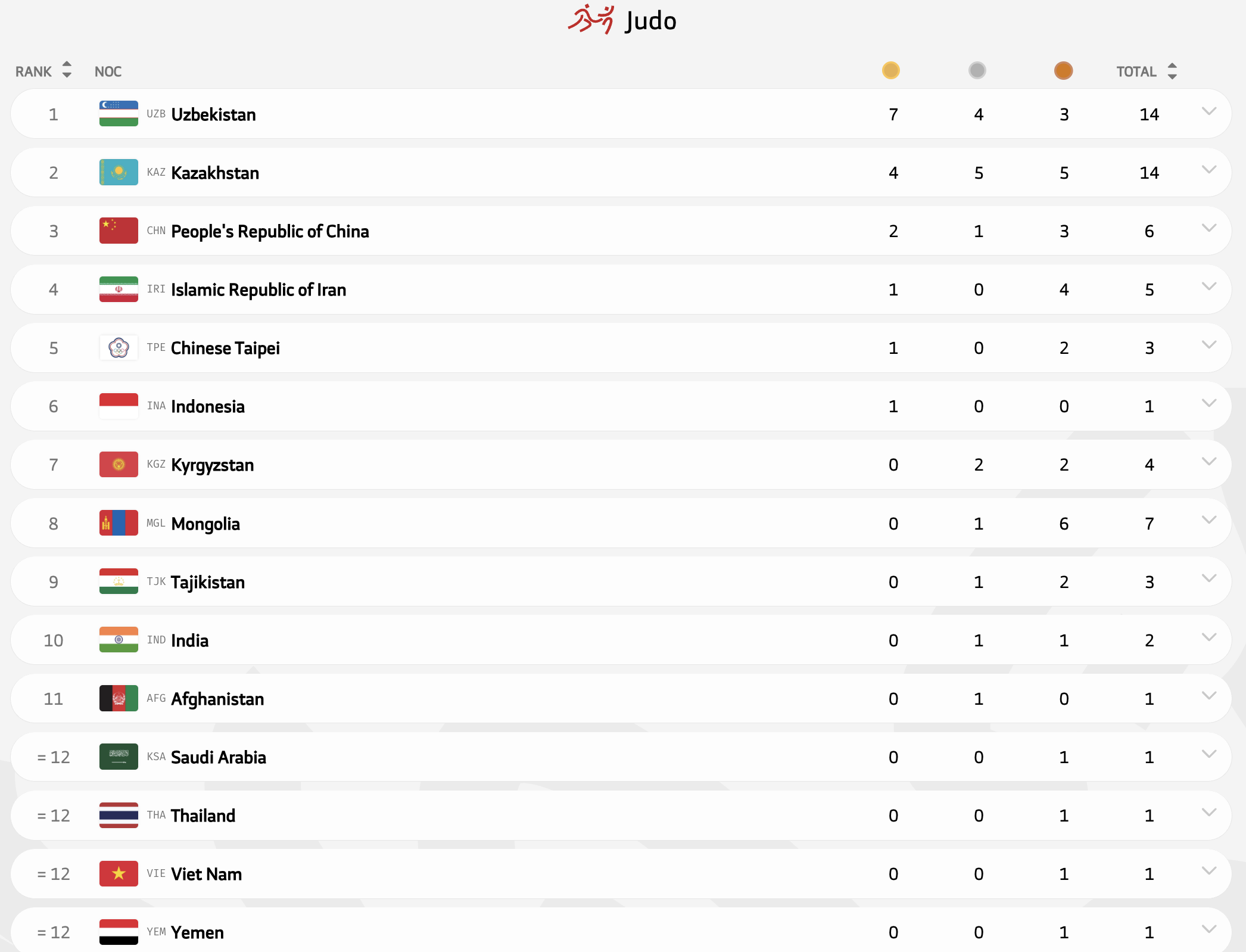 В дзюдо Казахстан стал вторым, уступив только Узбекистану. У обеих команд по 14 медалей, но у Узбекистана семь золотых, а у Казахстана - четыре.