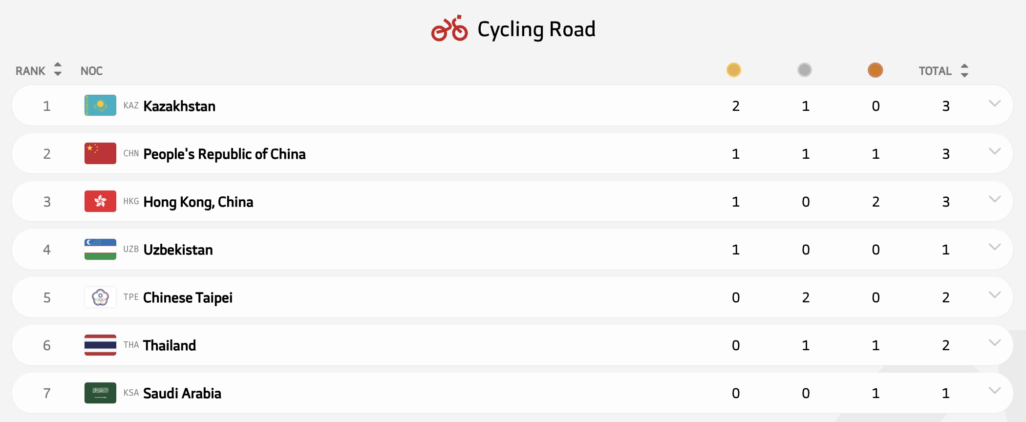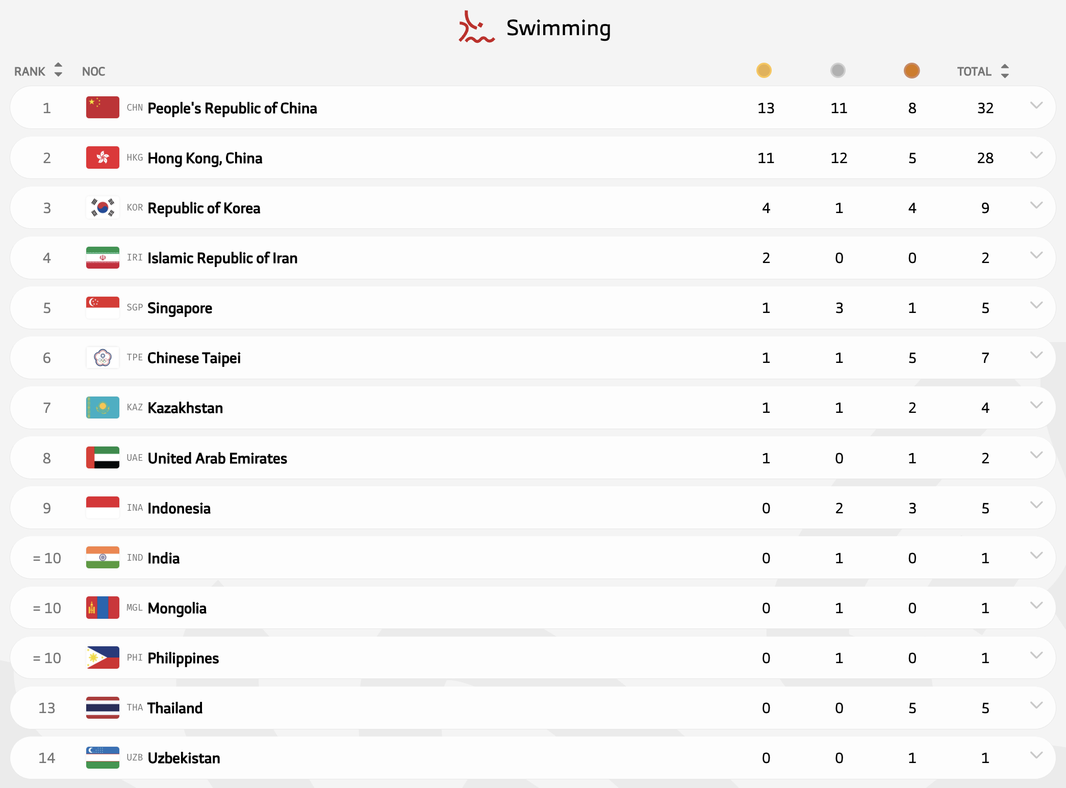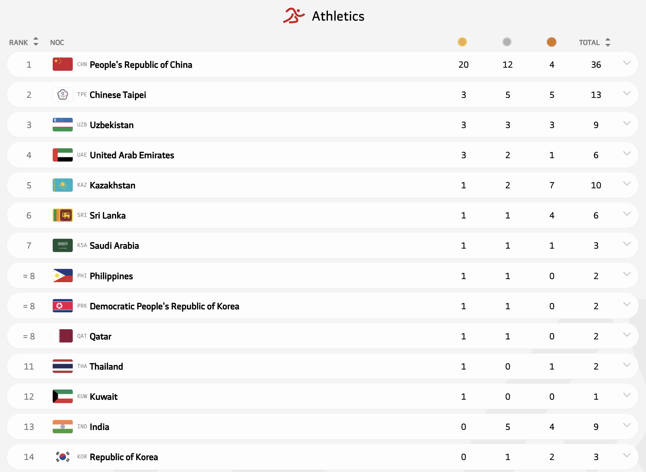 В легкой атлетике Казахстан взял десять медалей и одно золото. Этого хватило для пятого места в медальном зачете - выше ОАЭ, Узбекистан и Китайский Тайбэй, у которых по три золото. А безоговорочным лидером стал Китай, выигравший больше половины золотых медалей.