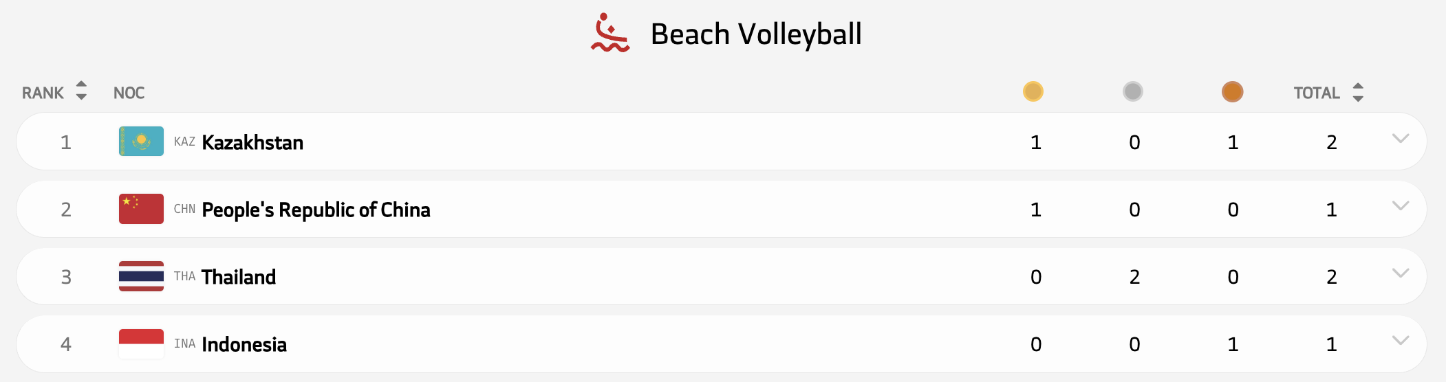 Казахстан стал лучшими в медальном зачете пляжного волейбола, где выиграл одно золото и одну бронзу.