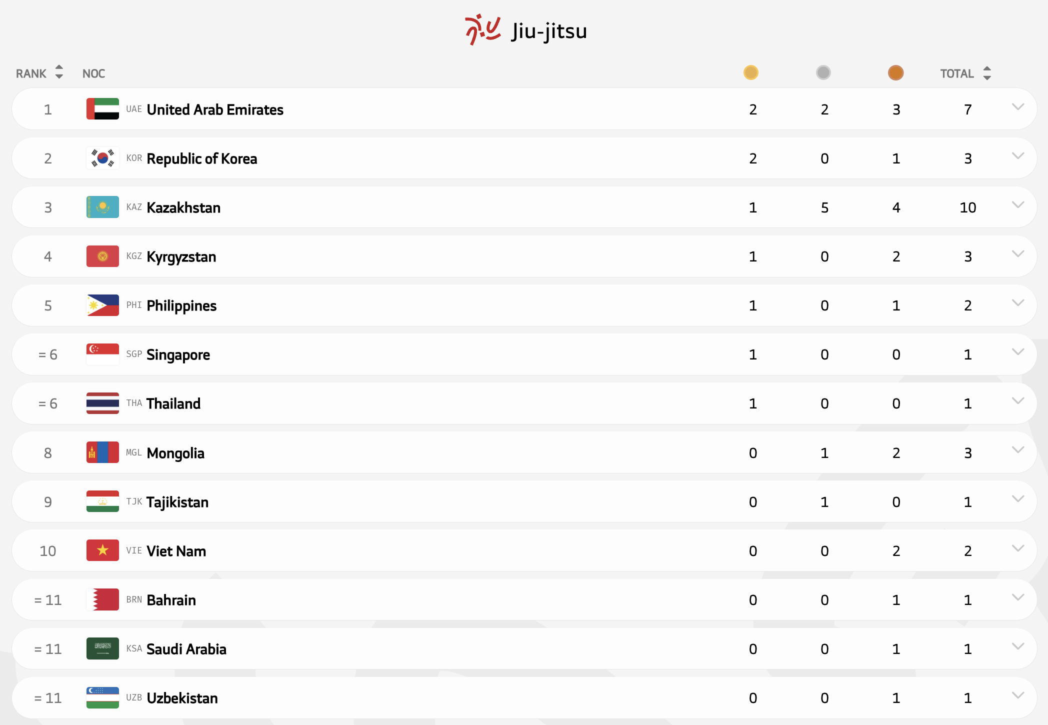 Казахстан взял больше всех медалей в джиу-джитсу - 10, но чемпионом стал только Абдулла Батырбек. В итоге третье место в медальном зачете - выше Южная Корея и ОАЭ.