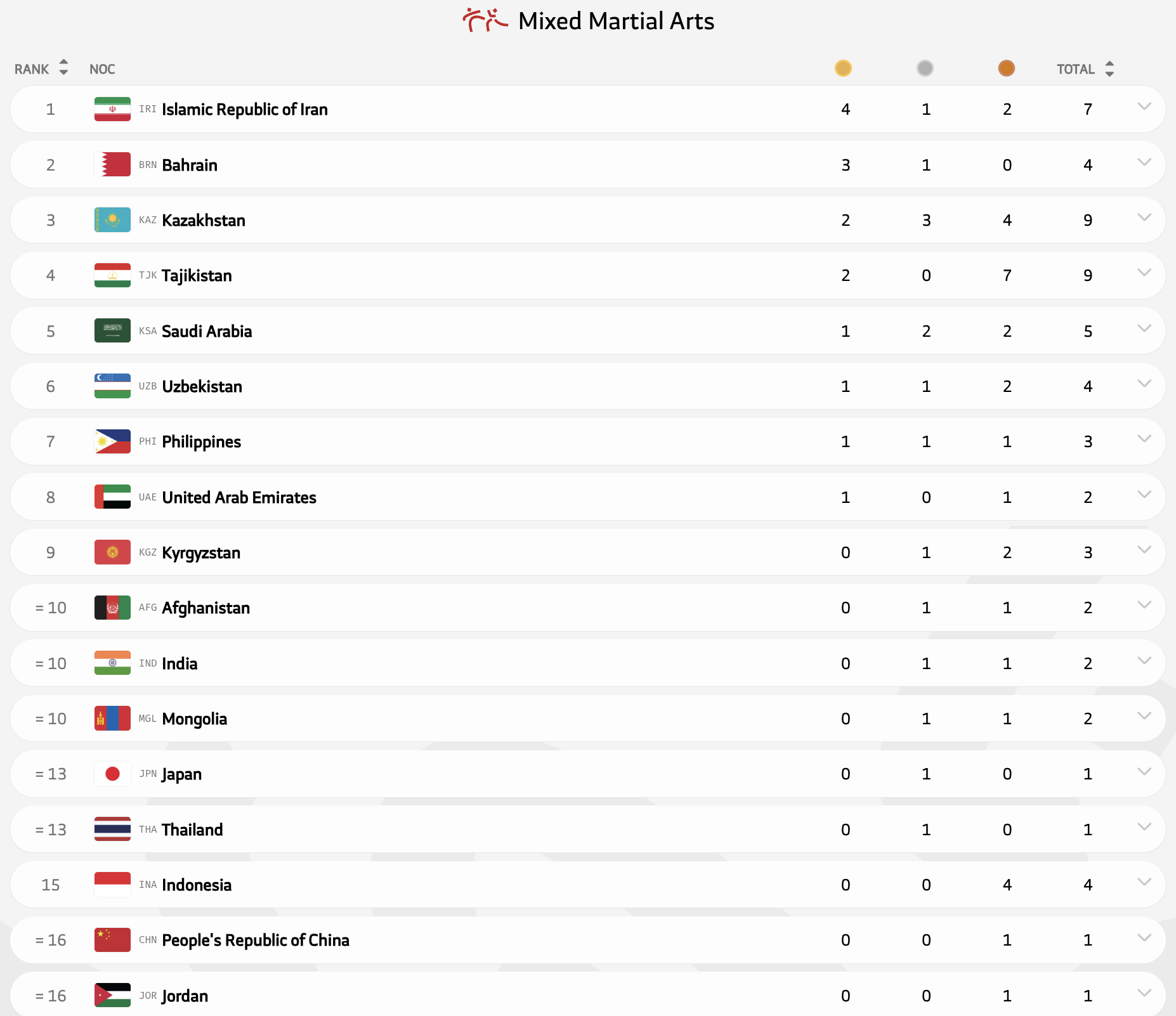 В ММА Казахстан также взял больше всех медалей - 9, рядом только Таджикистан. Два чемпиона - Санжар Картай и Амелина Бакиева, и третье место в медальном зачете.