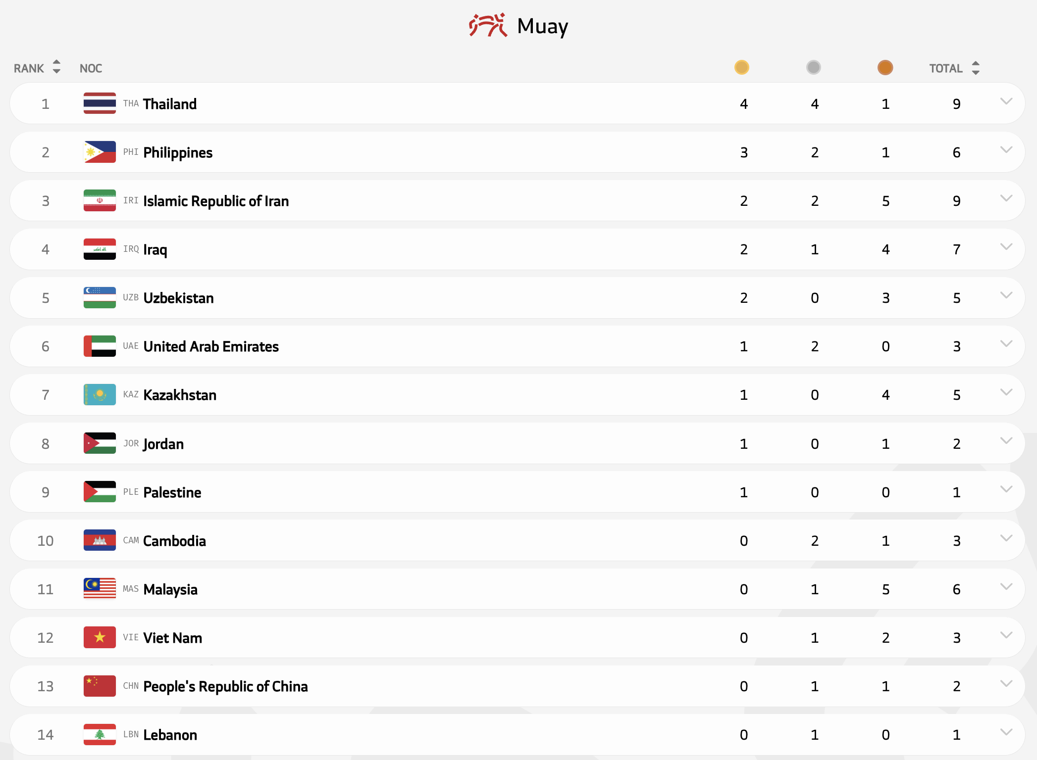 В муай-тай у Казахстана одна чемпионка Альбина Жуминова и седьмое место в медальном зачете.