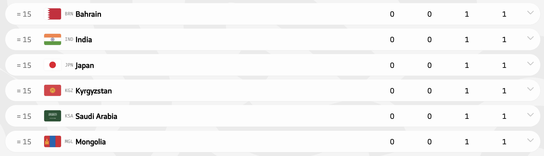 - Индия выиграла женский зачет - 4-1-0, Казахстан - второй - 2-1-1, Узбекистан - третий - 1-2-2.