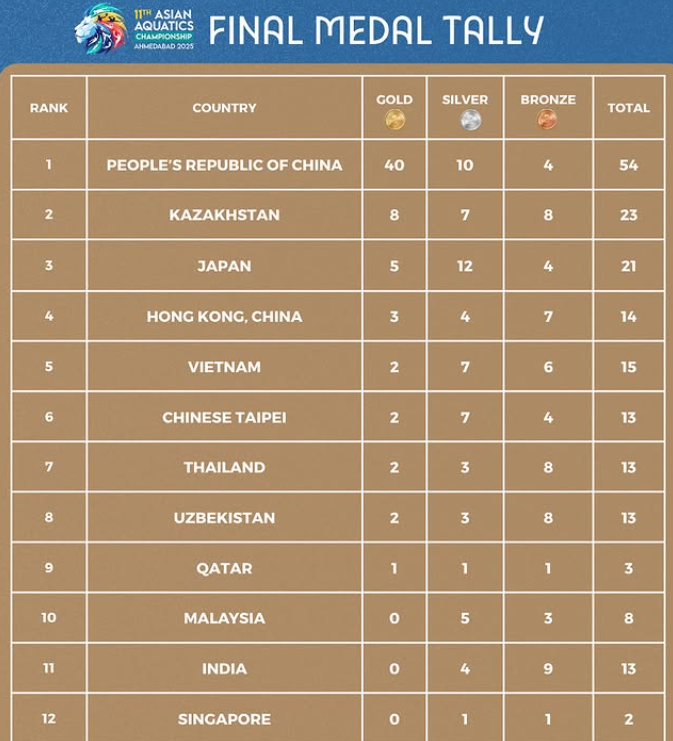 Сборная Казахстана заняла второе место в общем зачете чемпионата Азии по водным видам спорта, прошедшем в Ахмедабаде (Индия), сообщает Спорт Шредингера.