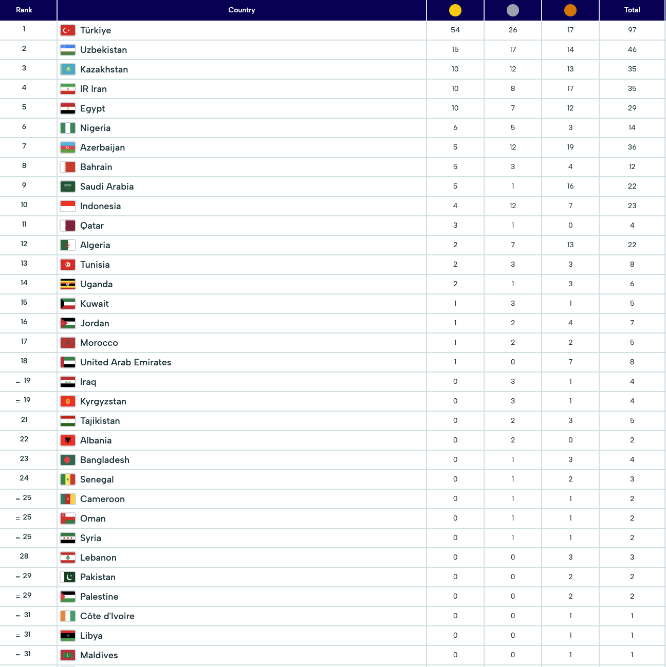 Впереди остаются только Турция (54–26–17) и Узбекистан (15–17–14). До Узбекистана теперь пять золотых, но чтобы обойти и выйти на второе место - нужно шесть побед.