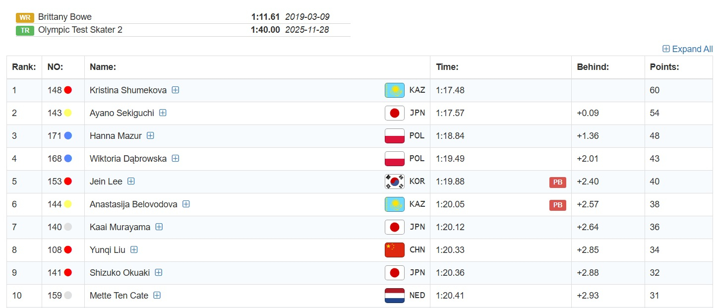 На 1000 метров Шумекова показала результат 1.17.48 сотых секунды. В топ-3 японка Аяно Секигучи и Ханна Мазур из Польши.
