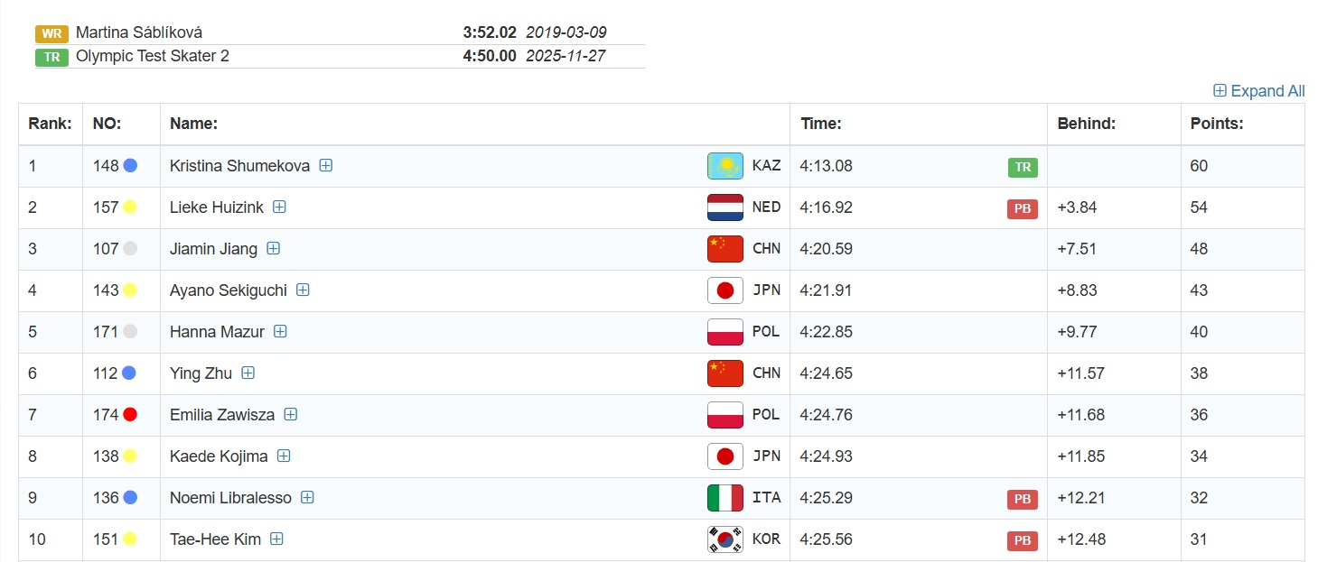 На дистанции 3000 метров Кристина Шумекова показала лучшее время в истории трассы - 4.13.08. В тройке лучших также Лейке Хюйзинк из Нидерландов и китаянка Цзяминь Цзян.