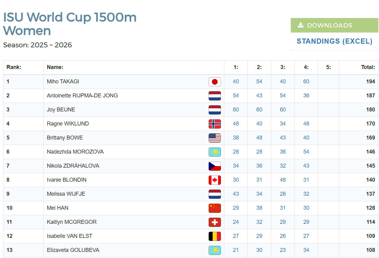 В общем зачете Кубка мира Надежда Морозова располагается на шестой позиции. В Норвегии казахстанка показала лучший результат – общее количество баллов составляет 146.