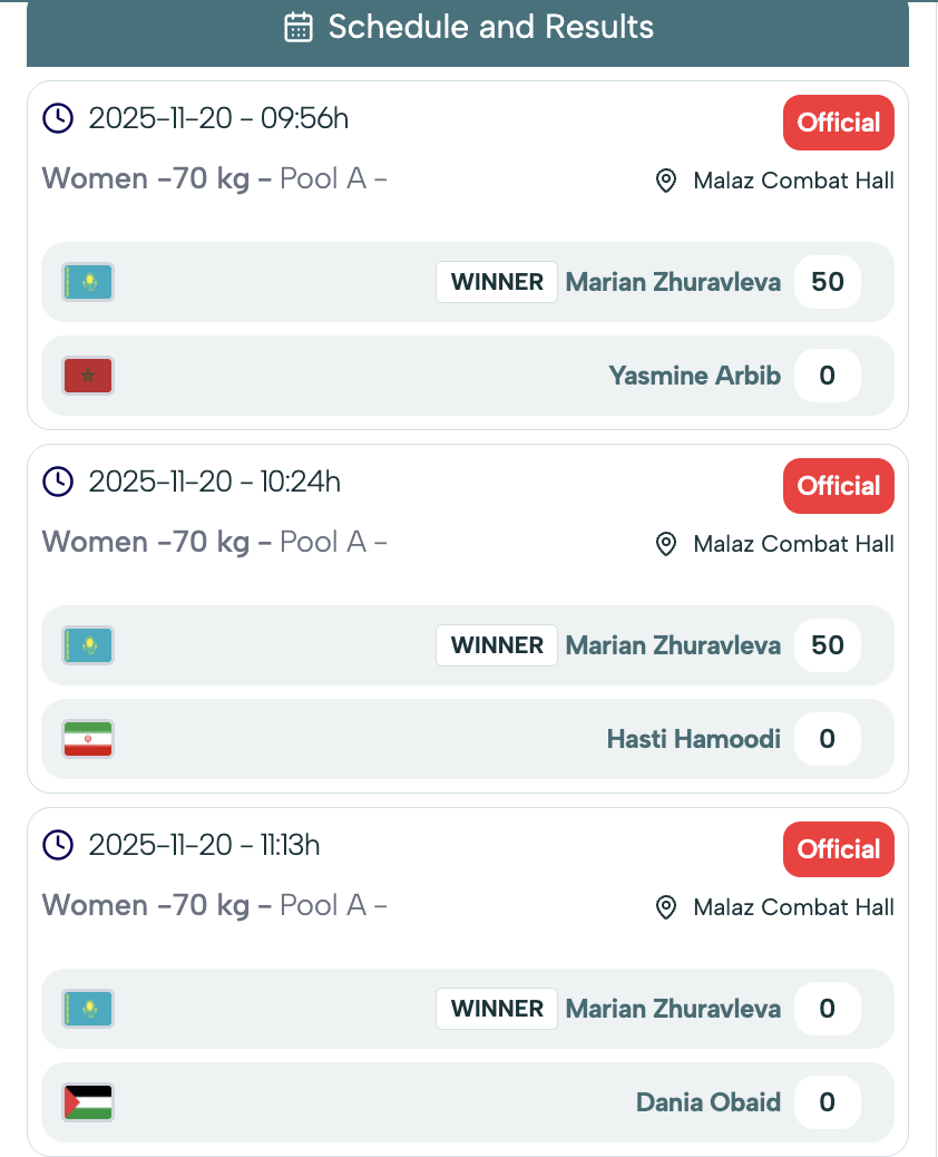 Казахстанская спортсменка последовательно одолела Ясмин Арбиб (Марокко), Данию Убайд (Палестина) и Хасти Хаммуди (Иран), уверенно став лучшей в своём дивизионе.